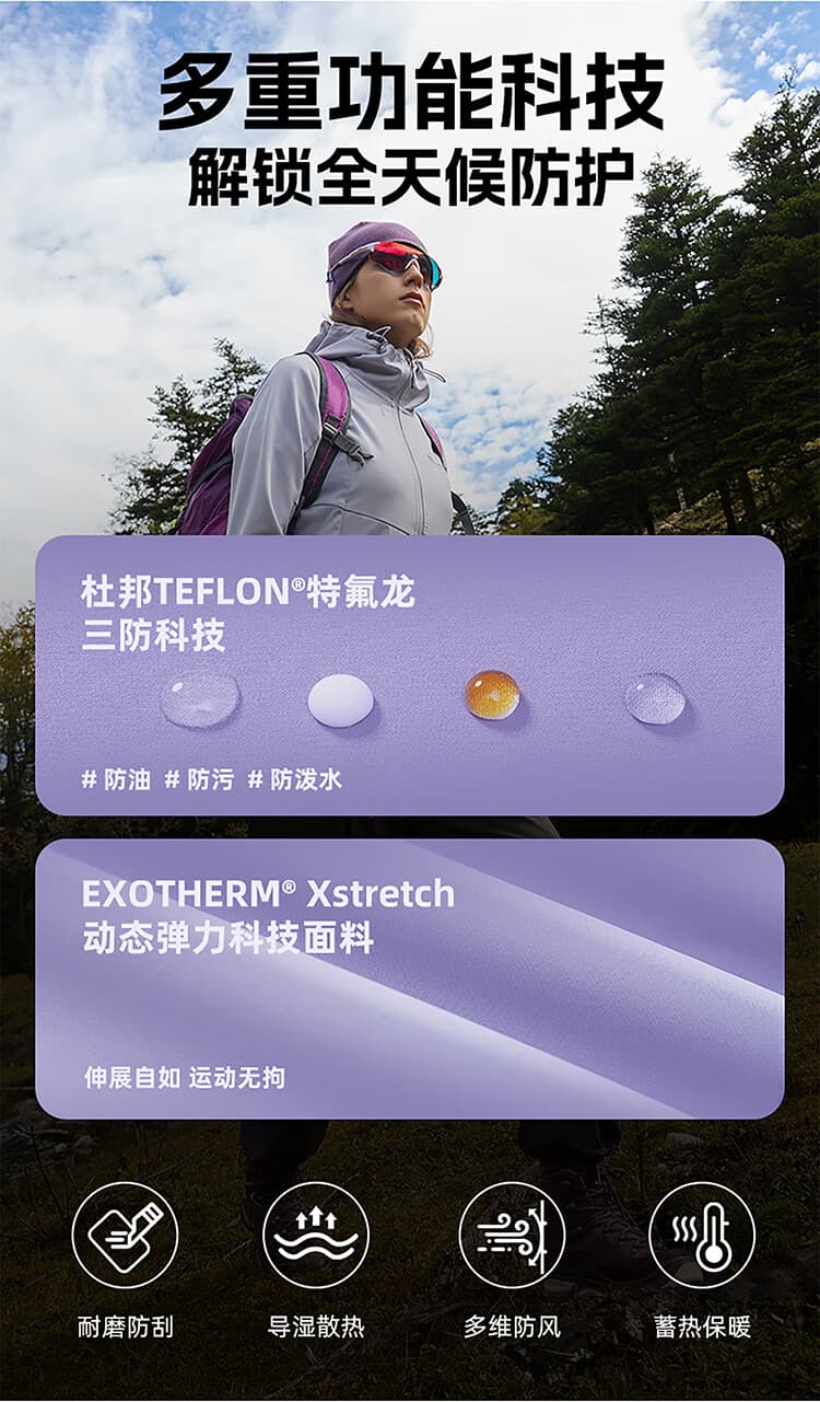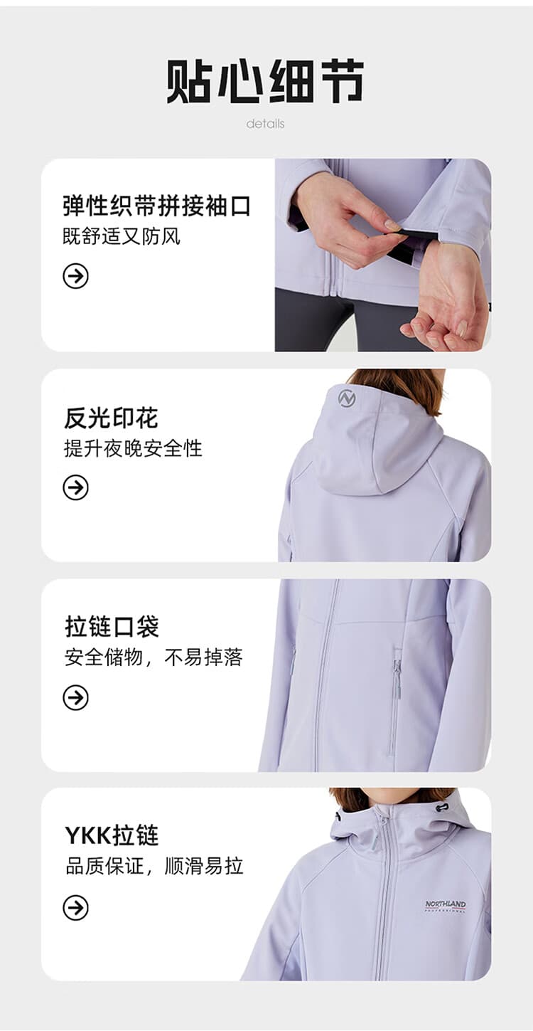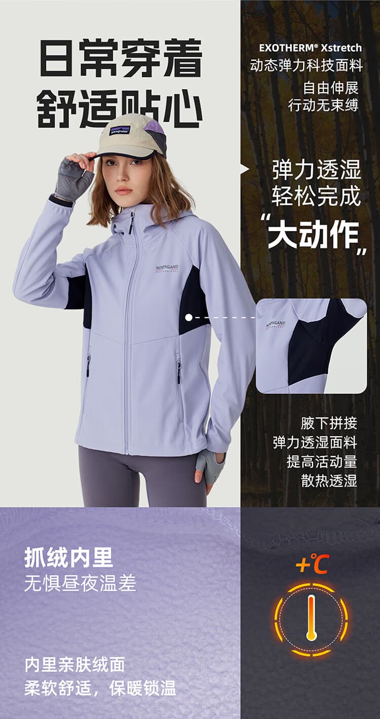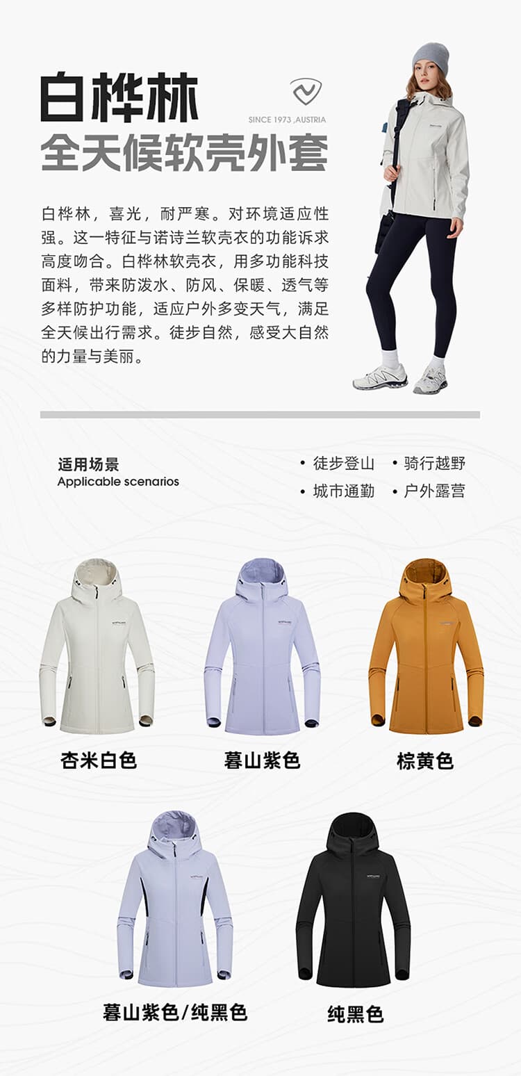 白桦林,喜光,耐严寒。对环境适应性强。这一特征与诺诗兰软壳衣的功能诉求高度吻合。白桦林软壳衣,用多功能科技面料,带来防泼水、防风、保暖、透气等多样防护功能,适应户外多变天气,满足全天候出行需求。徒步自然,感受大自然的力量与美丽。