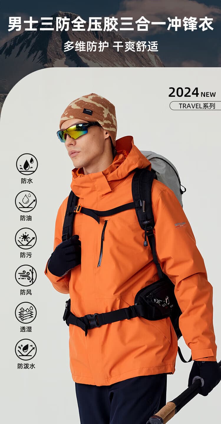 诺诗兰 【南松】冲锋衣 秋冬户外男全压胶防水三合一冲锋衣耐磨三防徒步登山服 NWJET5507E 柿橙色 舒适防静电 防水透湿 无缝压胶
