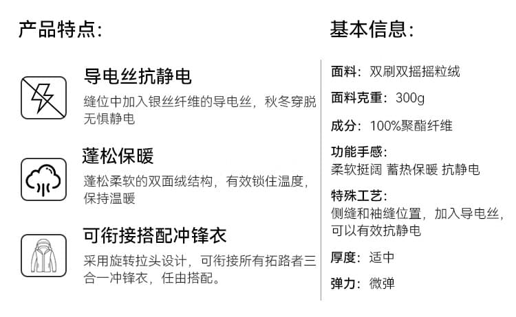 采用 300 克双刷双摇摇粒绒面料,借助蓄热科技,可快速聚热,360° 全方位锁温,24 小时持续保暖,蓬松柔软的双面绒结构,能有效留存热量,抵御寒风。