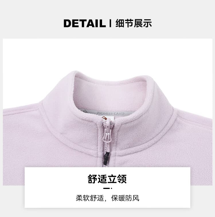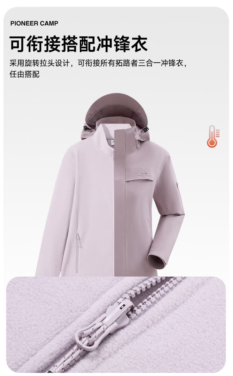采用旋转拉头设计,能与所有拓路者三合一冲锋衣衔接,适配多场景;同时,立领半高领开衫款式,搭配隐藏抽拉绳、微弹袖口等细节,提升穿着便利性与舒适度。