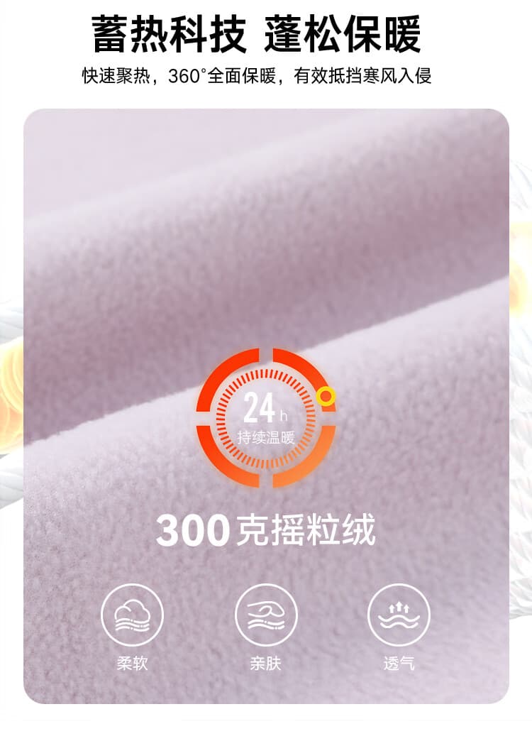 采用 300 克双刷双摇摇粒绒面料,借助蓄热科技,可快速聚热,360° 全方位锁温,24 小时持续保暖,蓬松柔软的双面绒结构,能有效留存热量,抵御寒风。