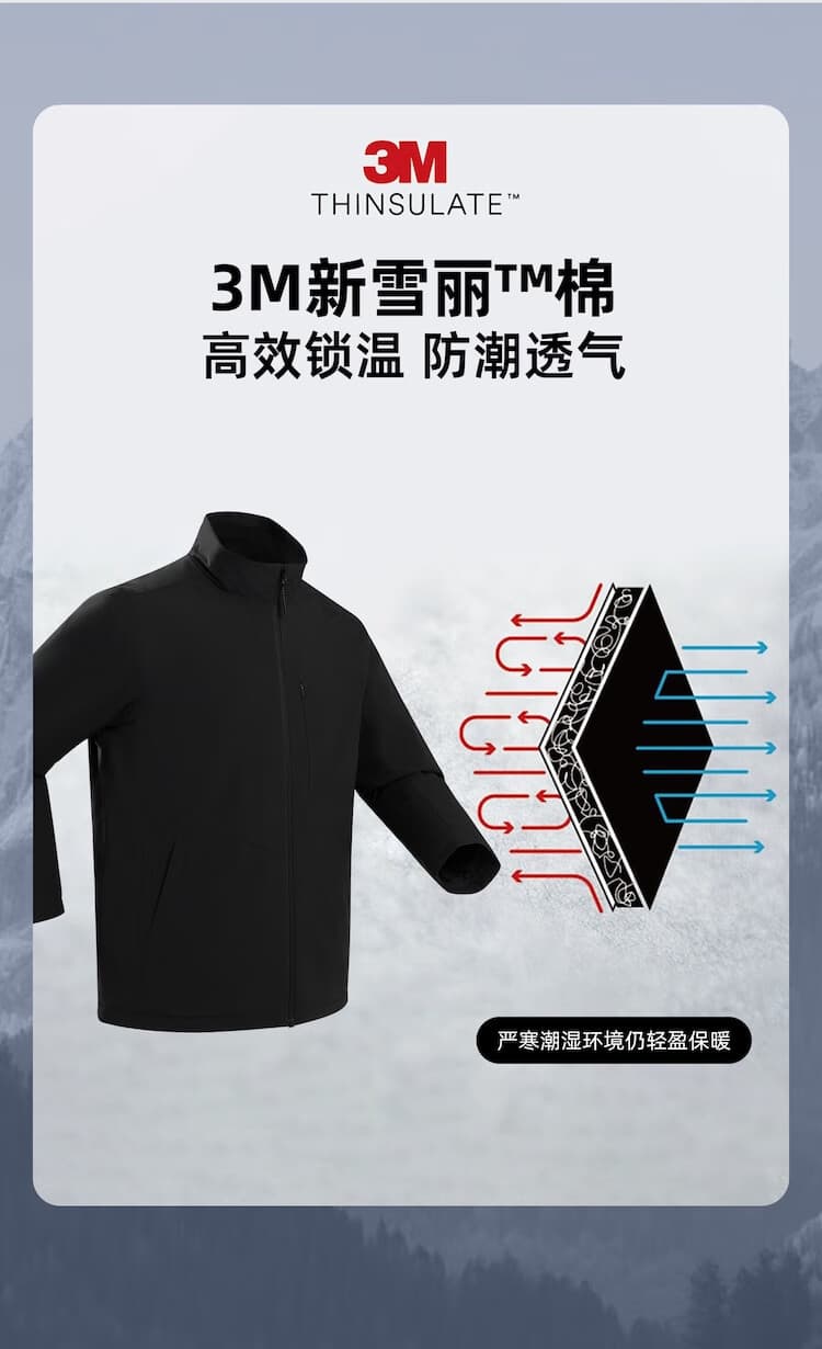 采用3M 新雪丽?高蓬松棉,高效锁温且防潮透气,在严寒潮湿环境下依旧能实现轻盈保暖,从材质根源解决冬日保暖难题,让你从容应对寒潮。
