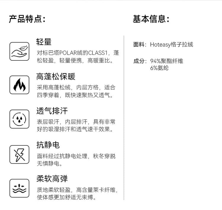 薄款轻量化版型,单穿利落或?髂诘ǎ┐钗薷旱!?br/>抗静电工艺处理,穿脱不粘衣,告别秋冬静电尴尬。