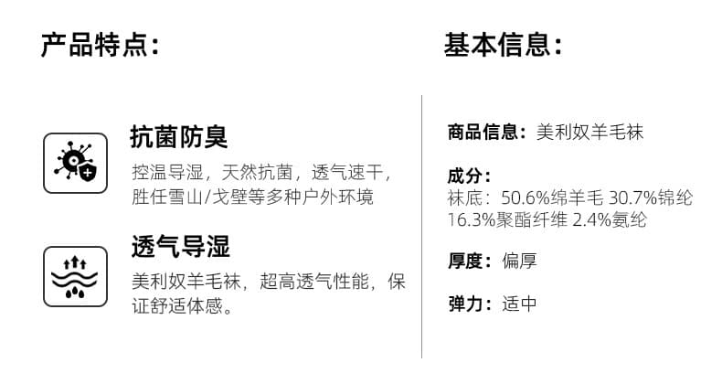 澳洲美利奴羊毛核心材质,天然抑菌防臭,久穿无异味;TiEF 透气导湿科技,吸湿排汗快,双脚干爽不粘腻。分段式加厚毛圈脚底减震,缓冲徒步冲击力,久走不累;足弓加固支撑,缓解长时间行走疲劳??span style="font-variant-numeric: normal; font-variant-east-asian: normal; font-variant-alternates: normal; font-size-adjust: none; font-language-override: normal; font-kerning: auto; font-optical-sizing: auto; font-feature-settings: normal; font-variation-settings: normal; font-variant-position: normal; font-variant-emoji: normal; font-stretch: normal; font-weight: 700; line-height: 24px; flex: 0 1 auto; flex-direction: row; justify-content: normal; align-items: normal; padding: 0px; margin: 0px; background-image: none; background-position: 0% 0%; background-size: auto; background-repeat: repeat; background-attachment: scroll; background-origin: padding-box; background-clip: border-box;">无骨缝合工艺,脚尖不硌脚,穿着超舒适。弹力罗纹袜口防滑不滑落,加固耐磨脚跟 / 脚趾,延长使用寿命;男女同款版型贴合脚型,黑色百搭不挑鞋款。
