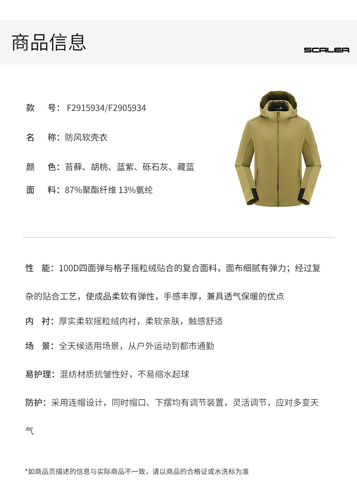 SCALER思凯乐 女 软壳衣 25秋冬户外防风连帽保暖冲锋衣内胆 登山服外套 F2915934 苔藓色