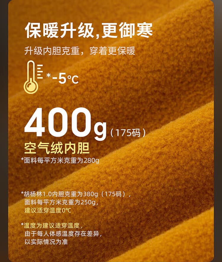 280g 空气绒内胆含导电丝,抗静电不粘衣,保暖性提升 23%。