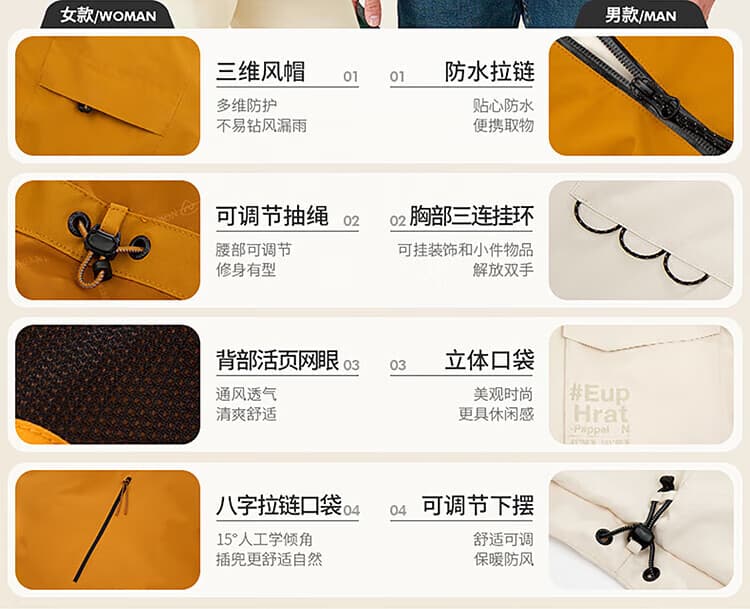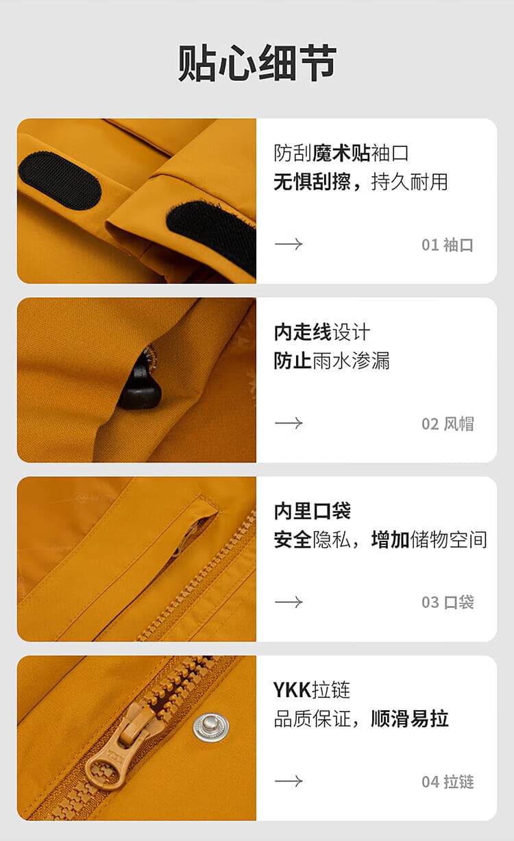 全衣 1.3cm 超薄压胶 + 防水 YKK 拉链,接缝严丝合缝不渗水。