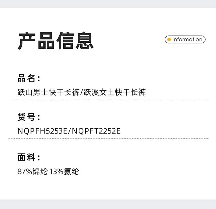 诺诗兰男女款速干长裤 NQPFH5253E,纯黑经典百搭不挑场景。