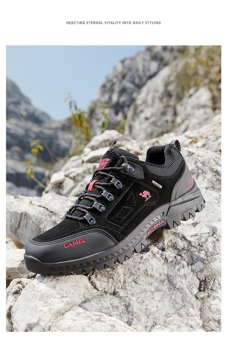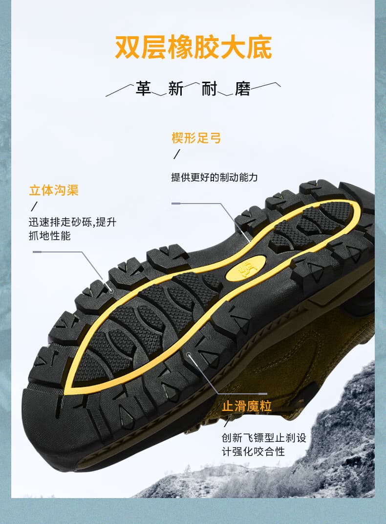 鞋头加厚橡胶防撞层,崎岖山路踢到碎石也能护趾周全。
