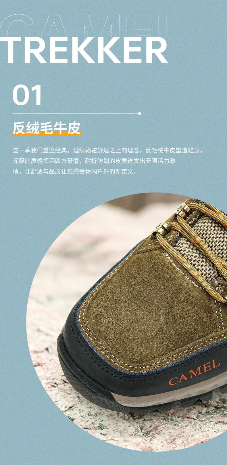 反绒牛皮拼接透气网布鞋面,耐磨抗造还能快速排湿。