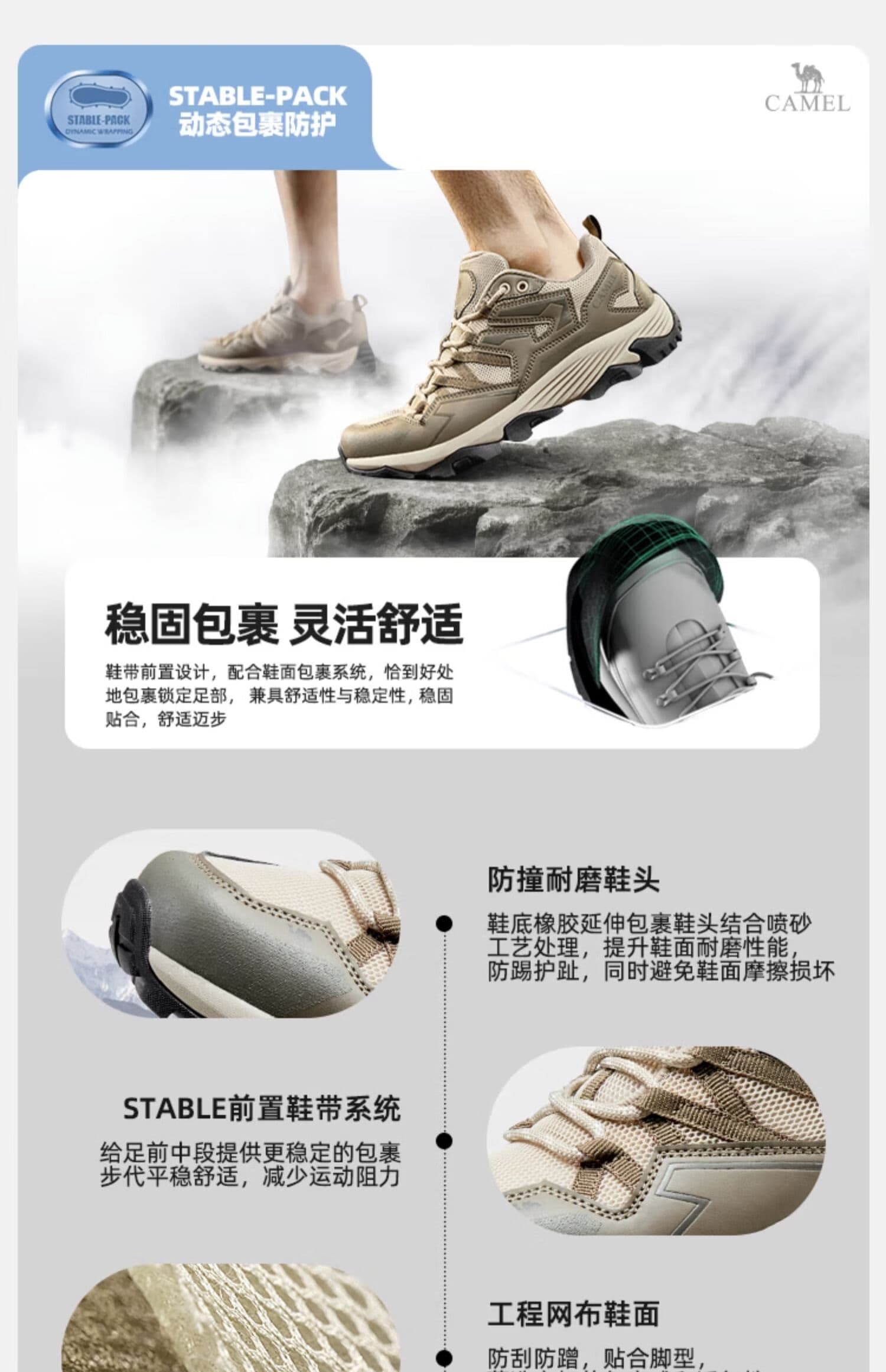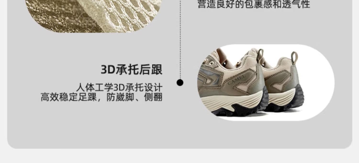 低帮设计灵活不束缚,脚踝活动自如,山地、戈壁穿越都适配。