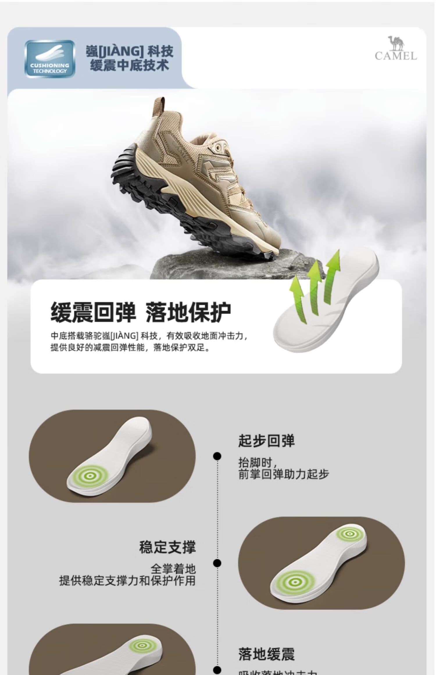 中底搭载缓震回弹科技,12mm 鞋跟落差分散地面冲击力,长距离行走不累脚。