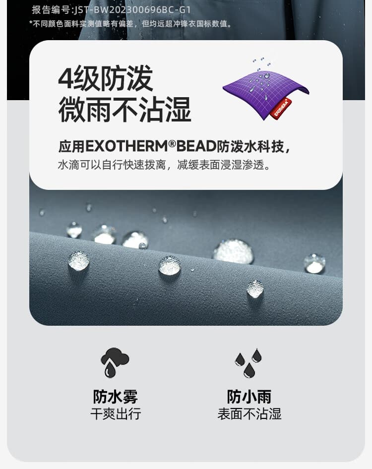 EXOTHERM? CLASSIC 科技面料,防水达 5001-10000mm,暴雨不渗漏。