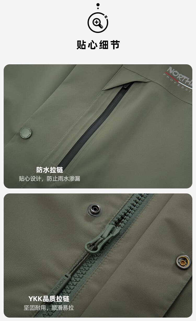 YKK 防水拉链,顺滑耐低温,户外使用不卡顿。