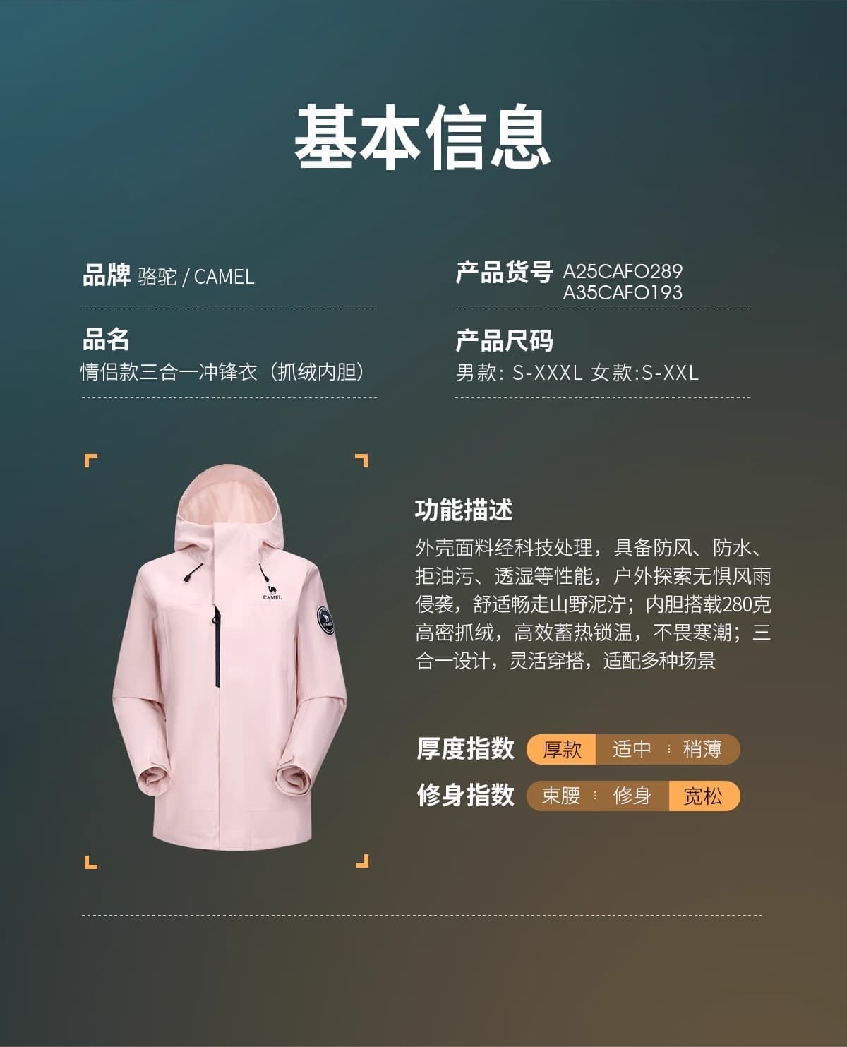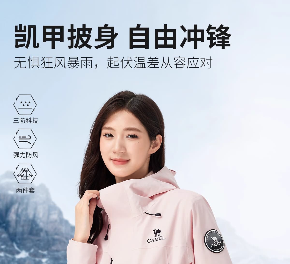 骆驼 A35CAFO193A 王者凯甲冲锋衣,远山蓝高级显白,男女同款户外通勤都适配。
