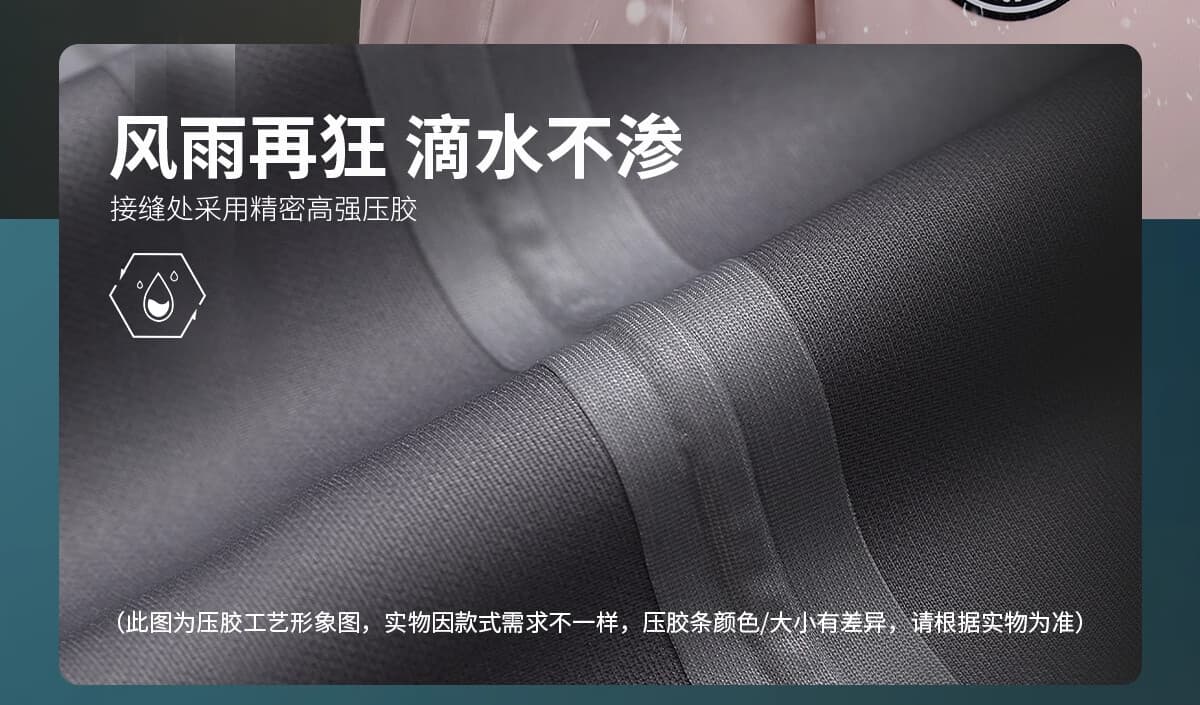 全接缝高温压胶工艺,密封针脚缝隙,杜绝雨水渗入。