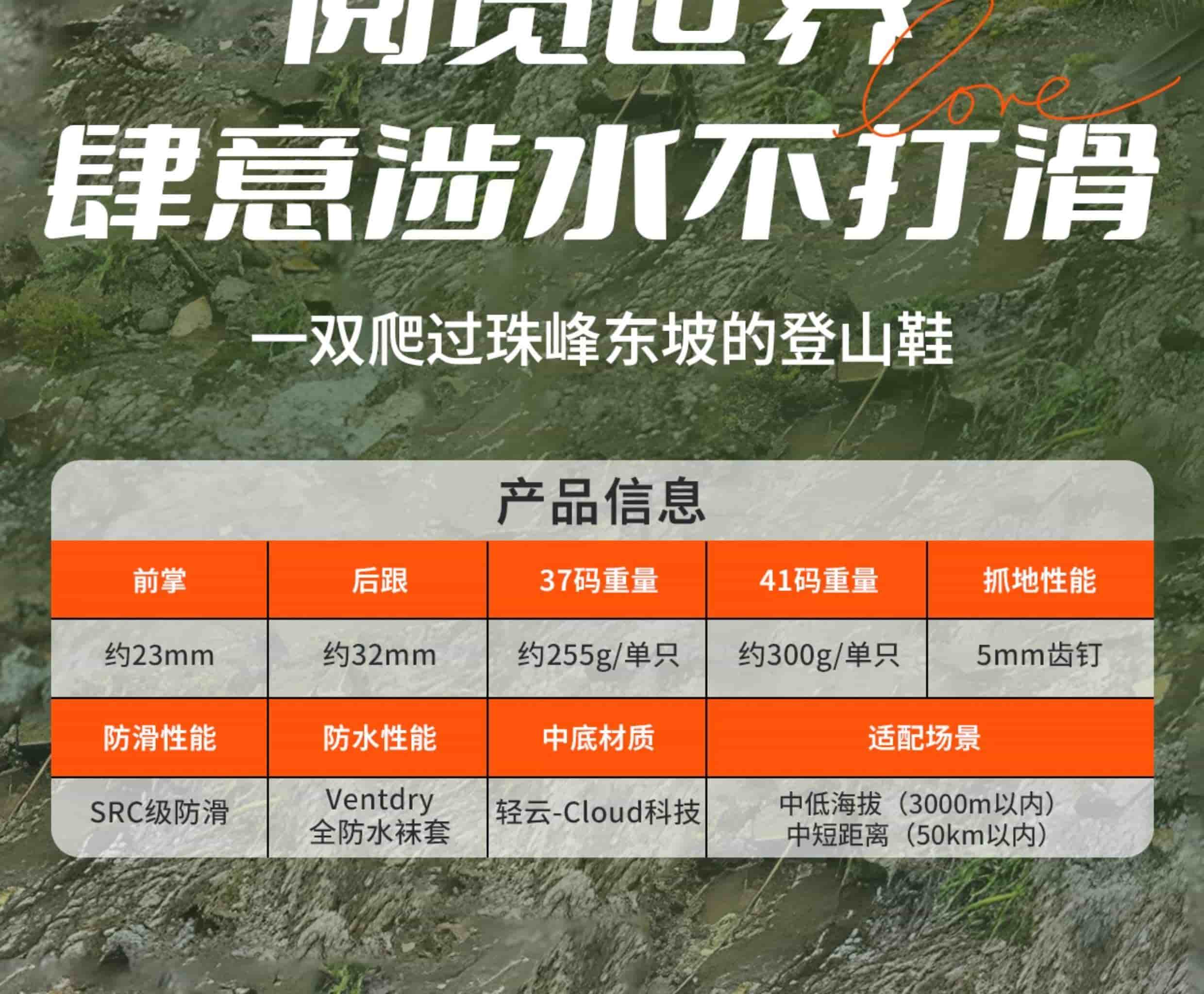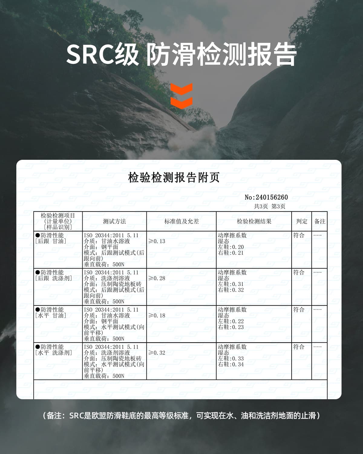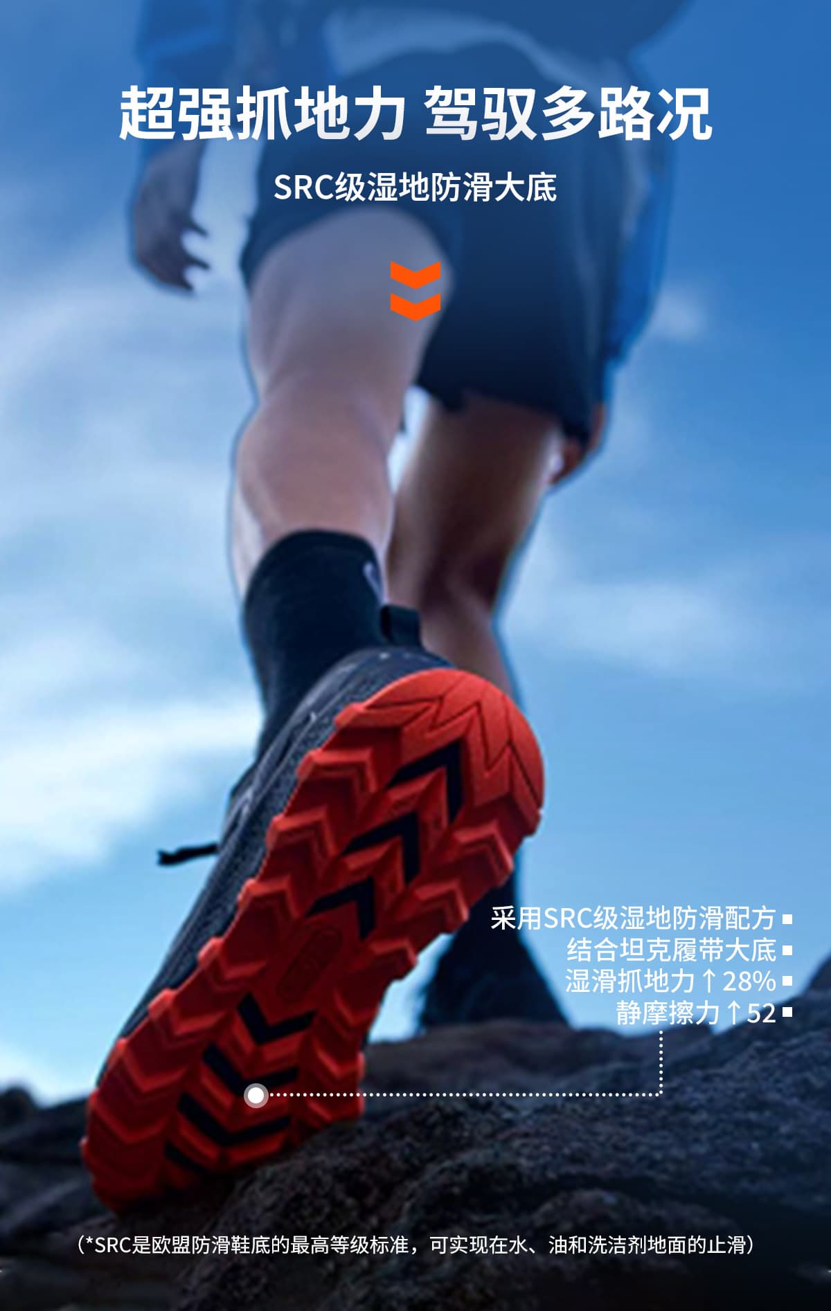SRC级湿地防滑大底:坦克履带大底+SRC级防滑,湿滑山路、碎石路抓地稳固,安全系数拉满。