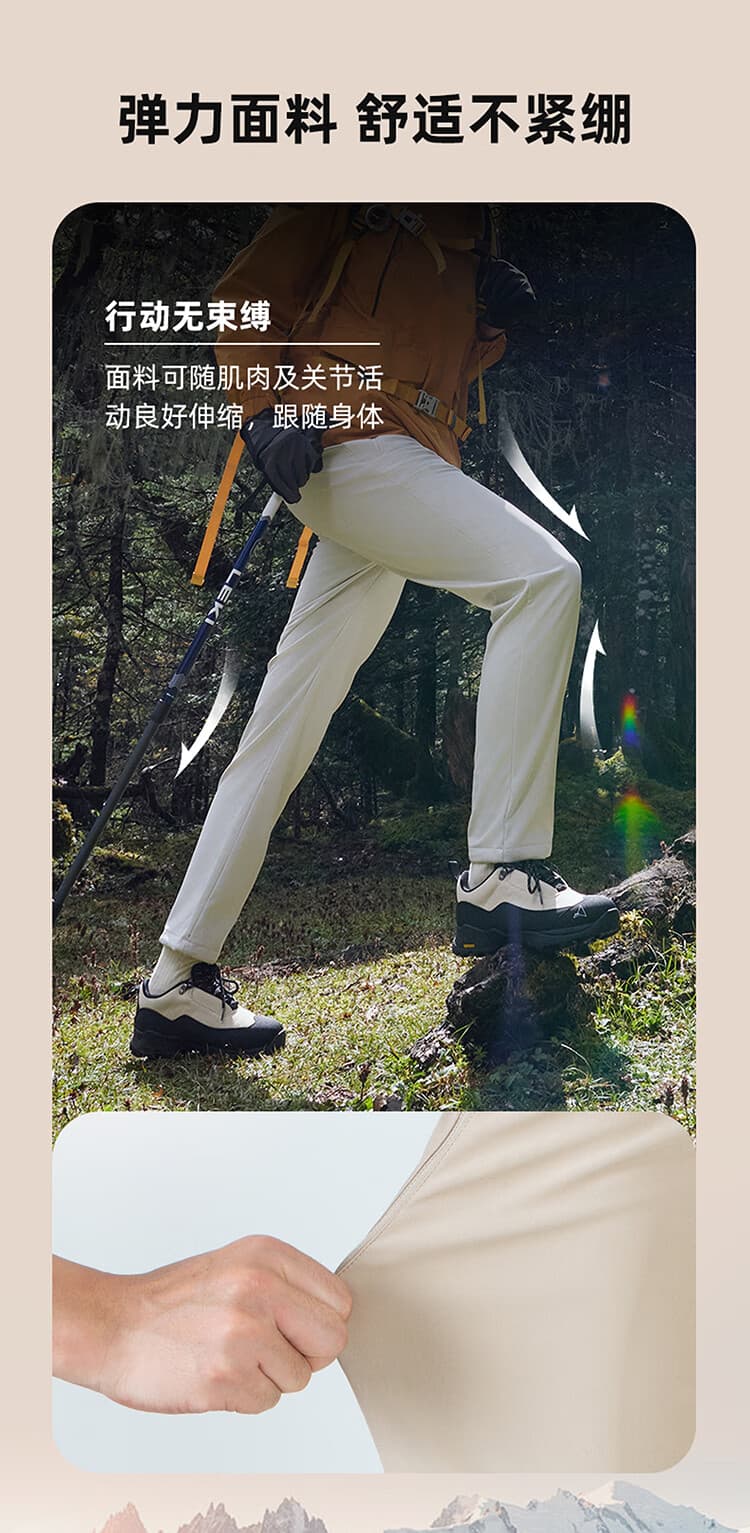 高弹力面料配合立体剪裁与钻石型一片式裆部设计,徒步登山时大幅动作灵活无束缚。