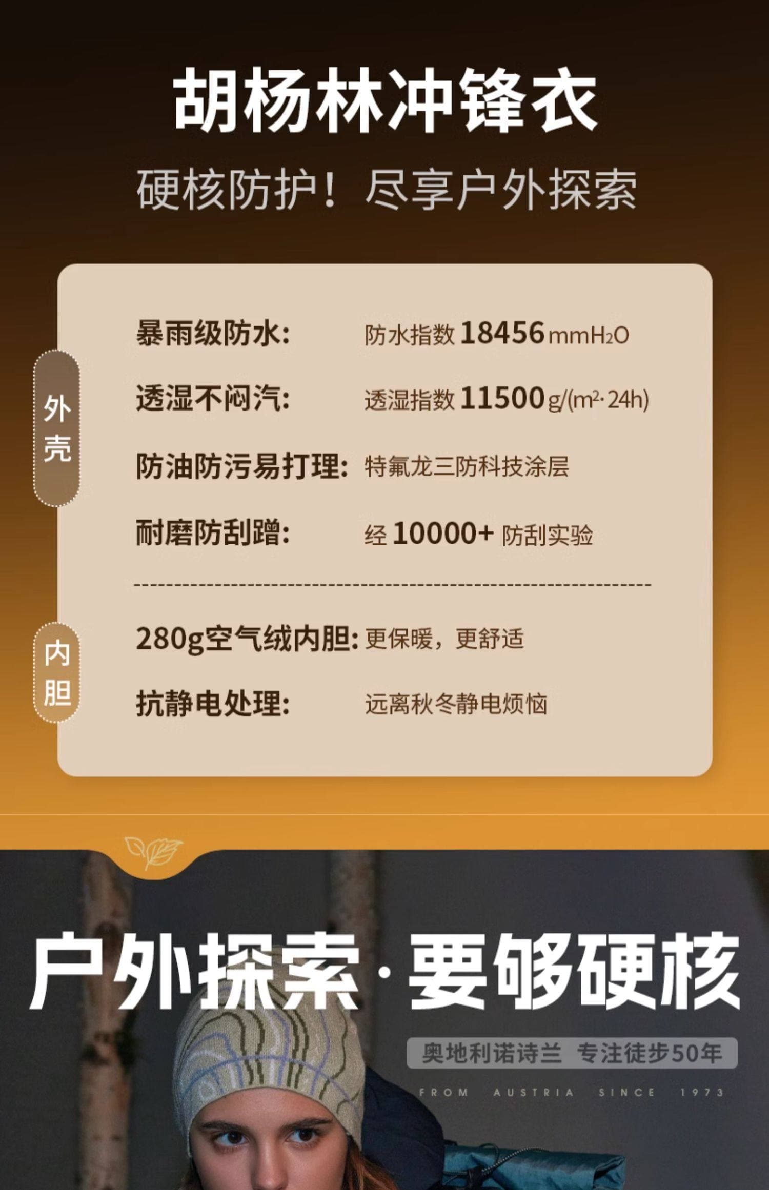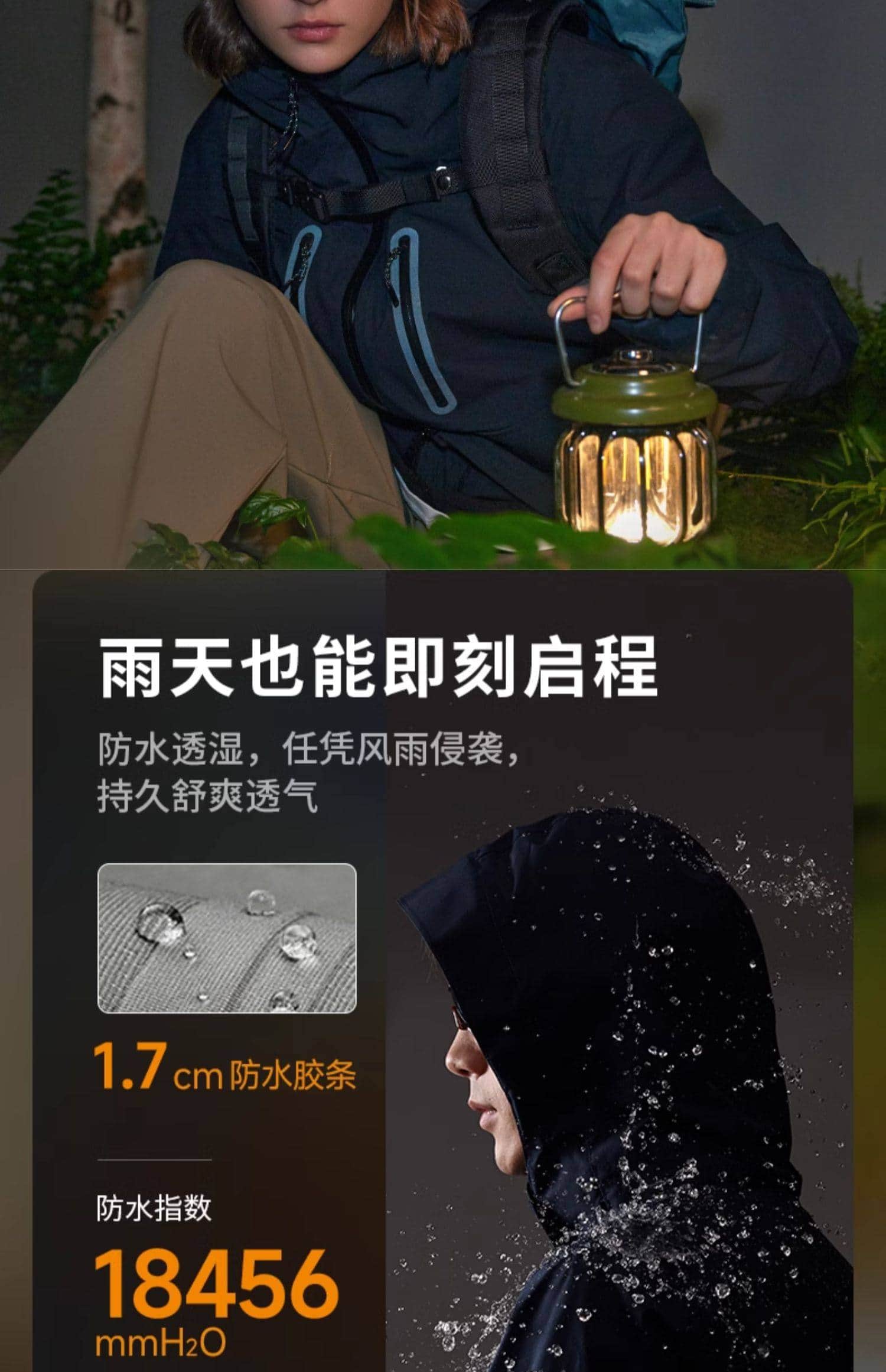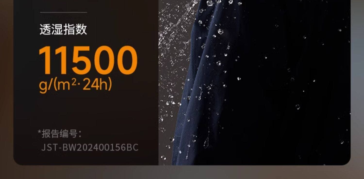 专业防风防水,防水指数 18000mmH?O,暴雨环境保持干爽