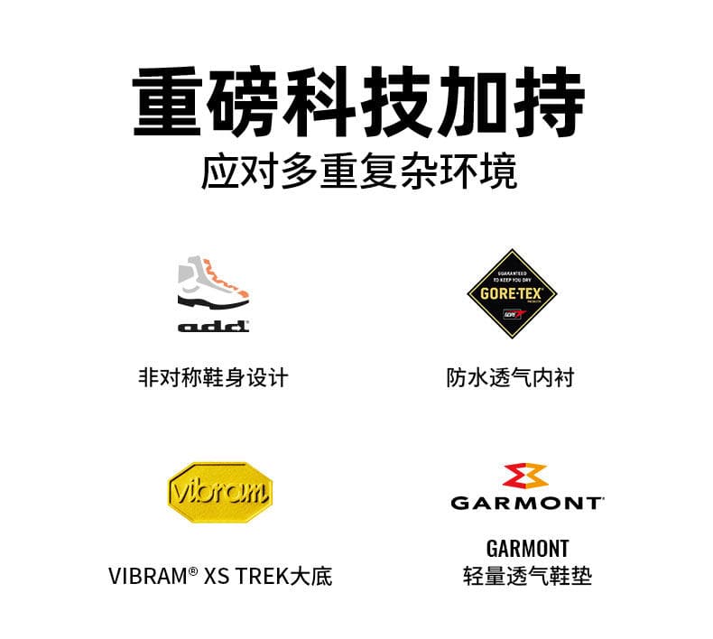 GORE-TEX防水内衬,ibram 防滑大底,复杂地形稳抓地