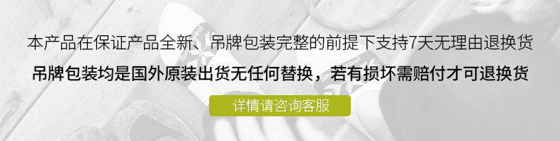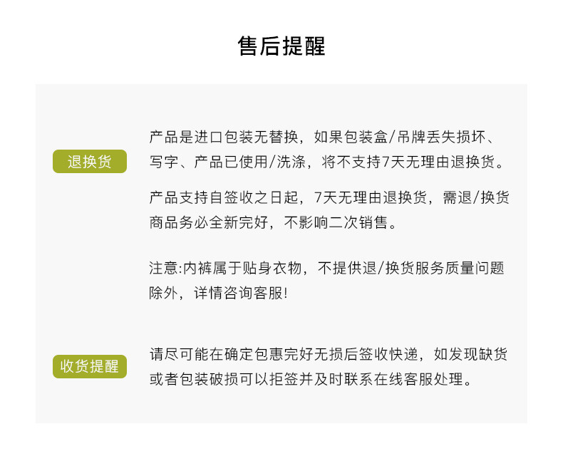 2)七天退换保障:自您签收商品后7天内,因尺码不合适,货品外观大小,颜色,形状的感受偏差,订购错误等,在商品未使用、未拆毁包装、未剪掉或丢失吊卡说明书等不影响二次销售的情况下,可以为您退换商品(下文中说明的不能退换的商品除外)。