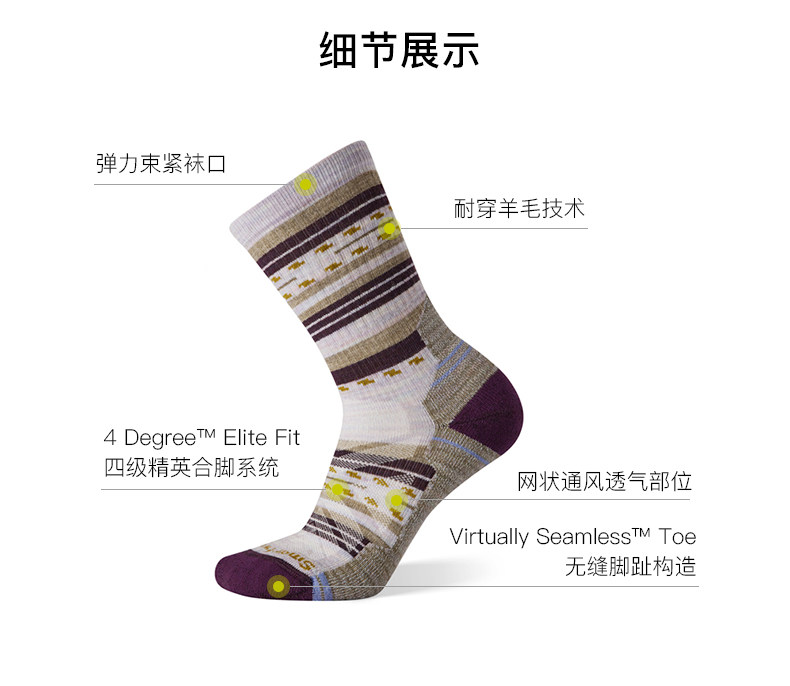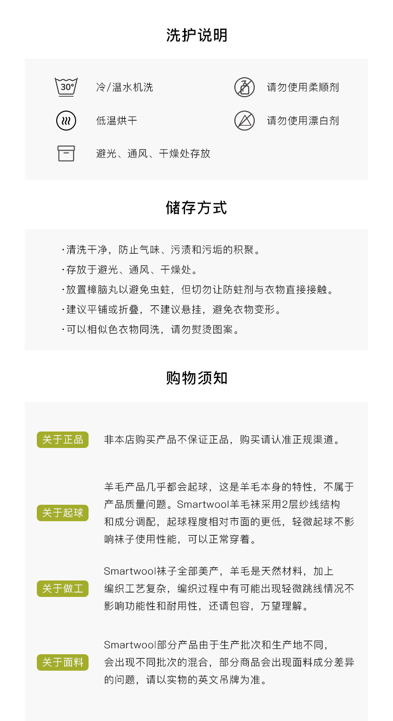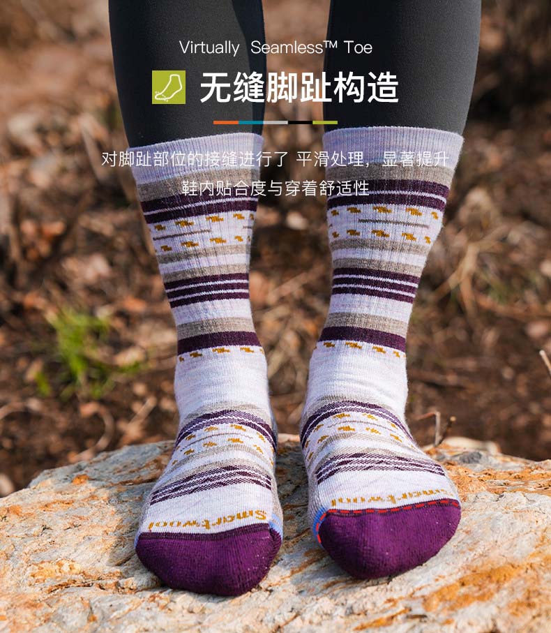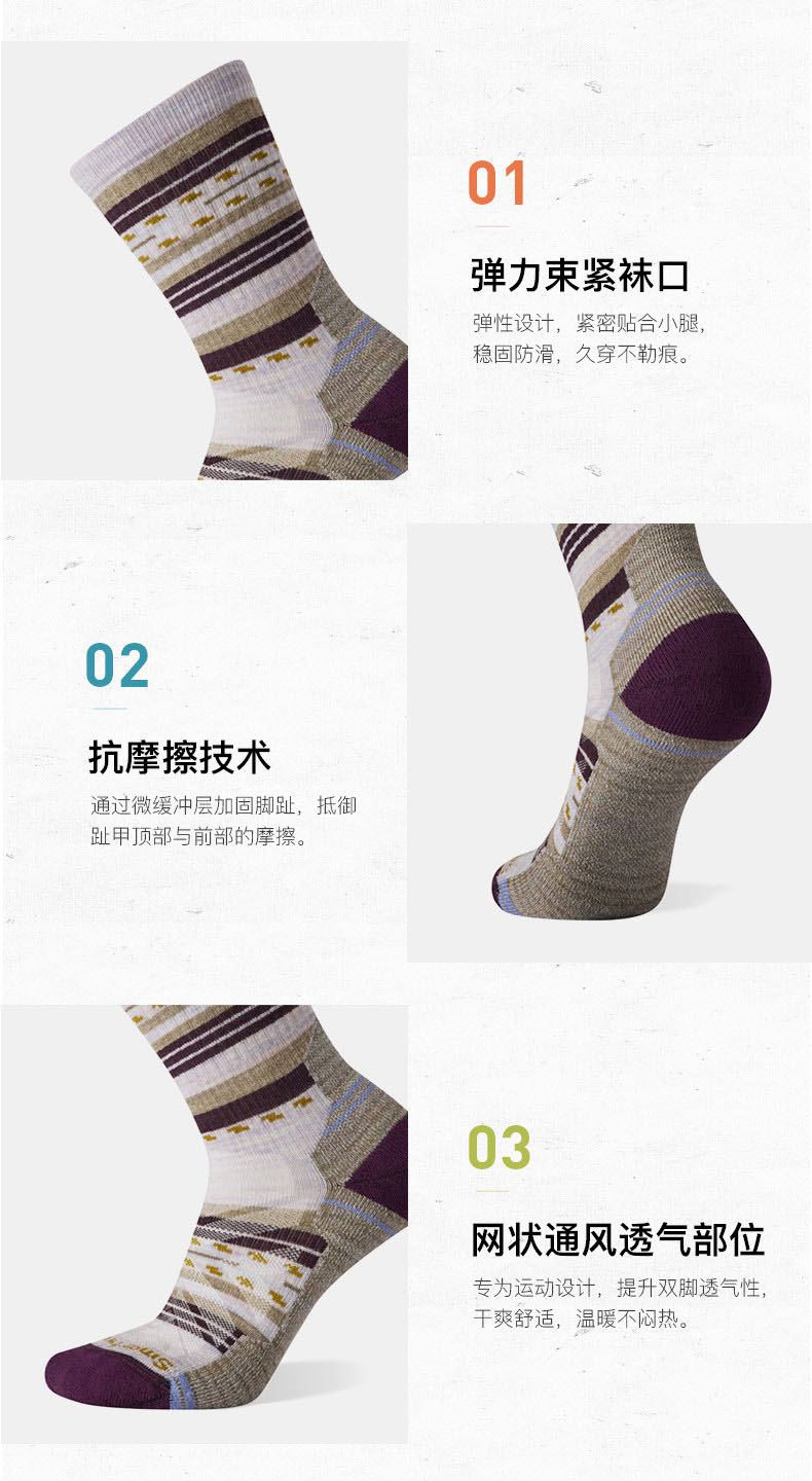 ?美利奴羊毛:细纤柔软不扎脚,自带吸湿控温、天然抗菌属性,户外袜优质材质。?Smartwool 混纺技术:美利奴羊毛搭配尼龙 + 氨纶科学配比,保留纯羊毛所有优点,还解决了纯羊毛耐磨差、易变形、干速慢的问题,户外使用更实用。