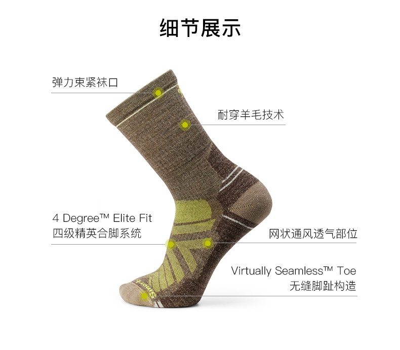 袜底轻量减震、易磨区 Indestructawool?耐磨加固,4 Degree?精英贴合系统 + 防滑袜口,久走不滑不勒,动态控温四季适配。