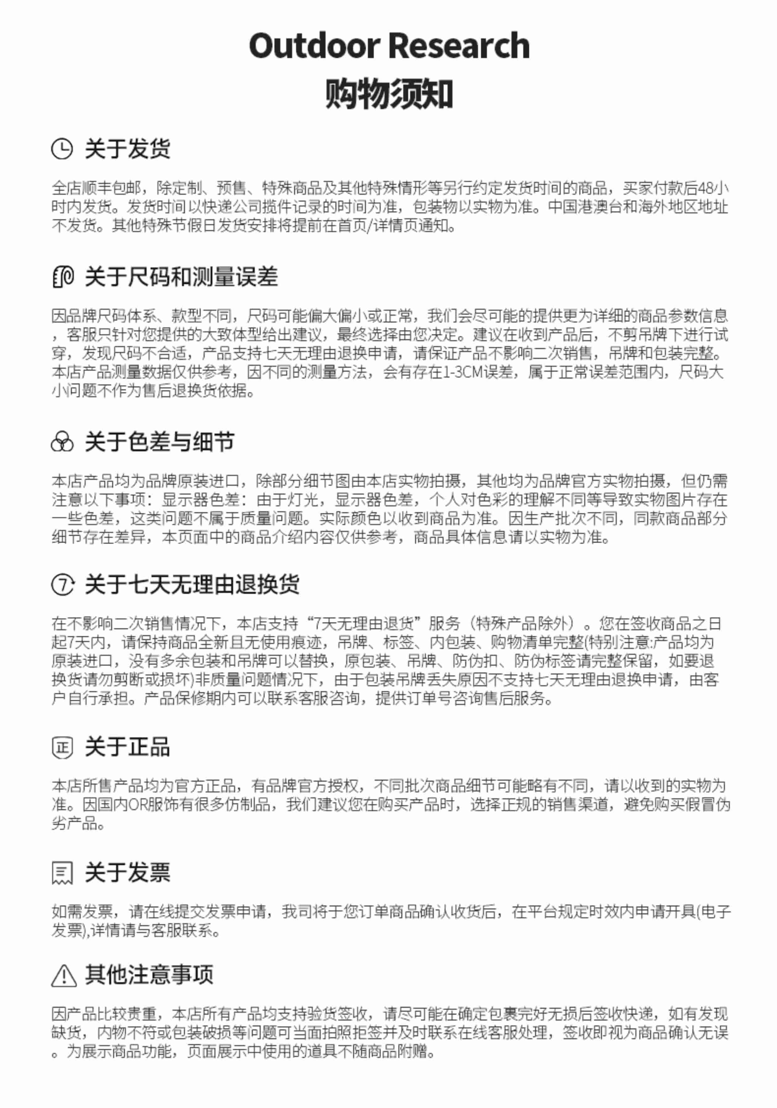 2)七天退换保障:自您签收商品后7天内,因尺码不合适,货品外观大小,颜色,形状的感受偏差,订购错误等,在商品未使用、未拆毁包装、未剪掉或丢失吊卡说明书等不影响二次销售的情况下,可以为您退换商品(下文中说明的不能退换的商品除外)。