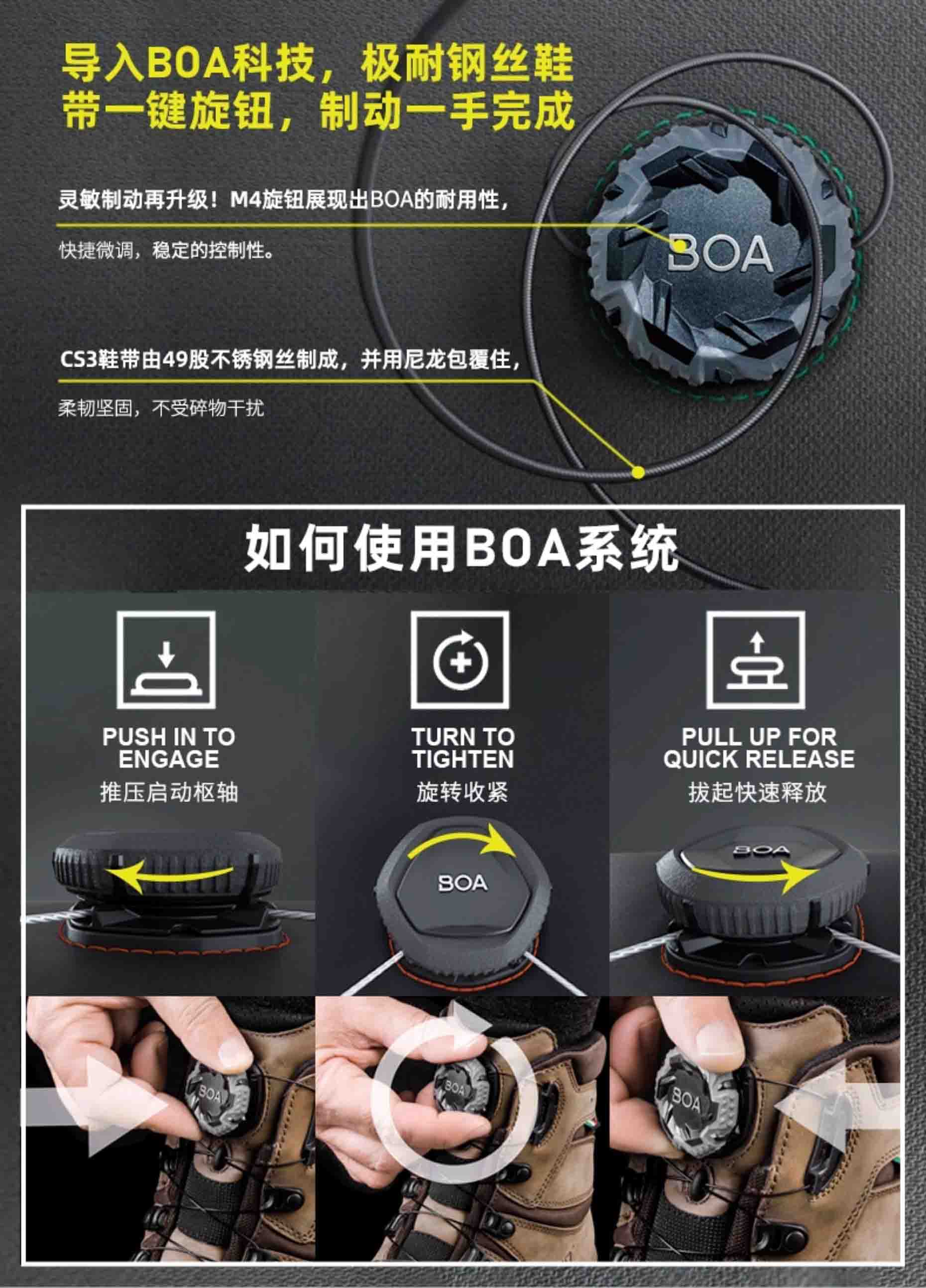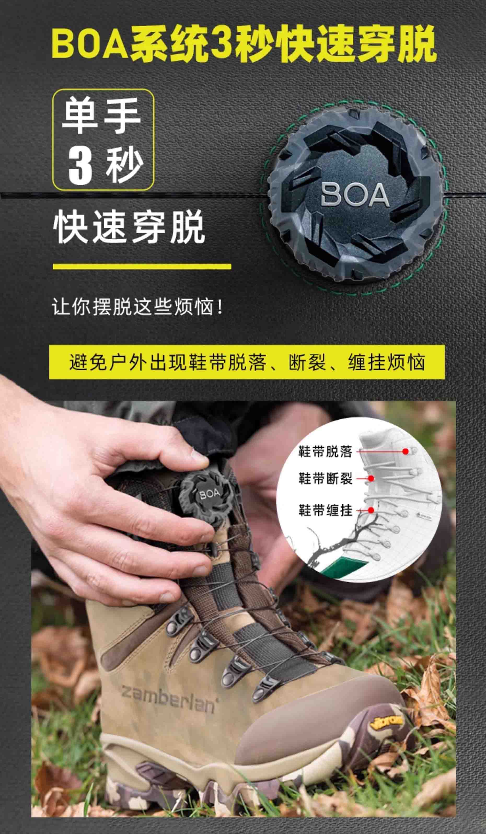 BOA? Fit System:户外快速系带黑科技,旋转旋钮即可精准调节松紧,比传统鞋带快 10 倍,戴手套也能操作,适配各种恶劣环境