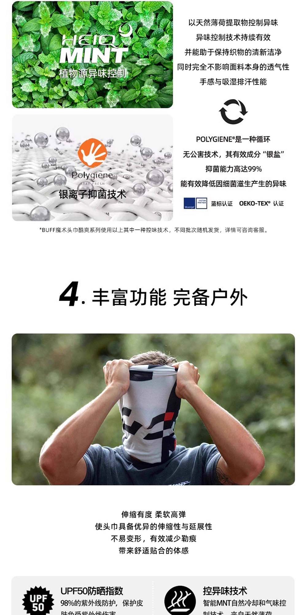 Polygiene 银离子抑菌:抑制细菌滋生,久戴无异味,户外长时间使用更清爽