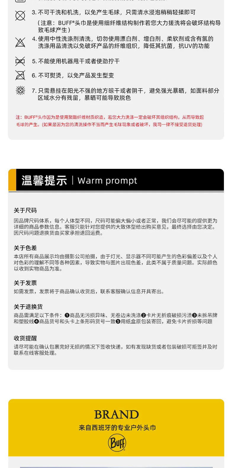 2)七天退换保障:自您签收商品后7天内,因尺码不合适,货品外观大小,颜色,形状的感受偏差,订购错误等,在商品未使用、未拆毁包装、未剪掉或丢失吊卡说明书等不影响二次销售的情况下,可以为您退换商品(下文中说明的不能退换的商品除外)。