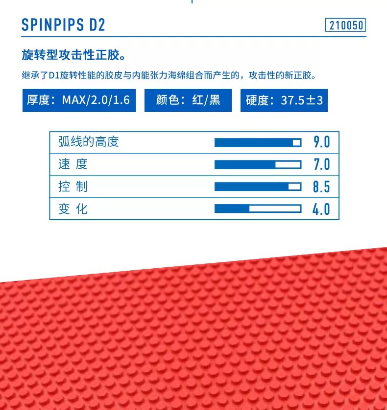 旋转系列正胶类套胶,适量的弹性海绵,和重新改良后的新的颗粒状的SUPER SPINPIPS单胶皮的组合,在所有正胶中此款正胶具有较强的旋转性能,也是旋转系列正胶的代名词,不光有旋转力,稳定性和扣杀的威力,还能轻易的打出侧旋球。