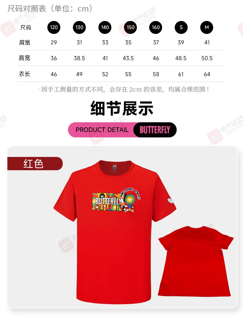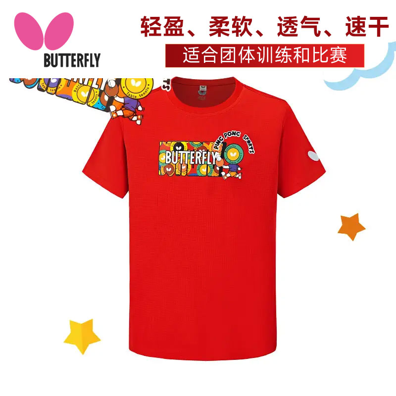 BUTTERFLY蝴蝶 乒乓球服 儿童圆领运动衫 乒乓球圆领运动T恤 CHD-809-01 短袖上衣 红色