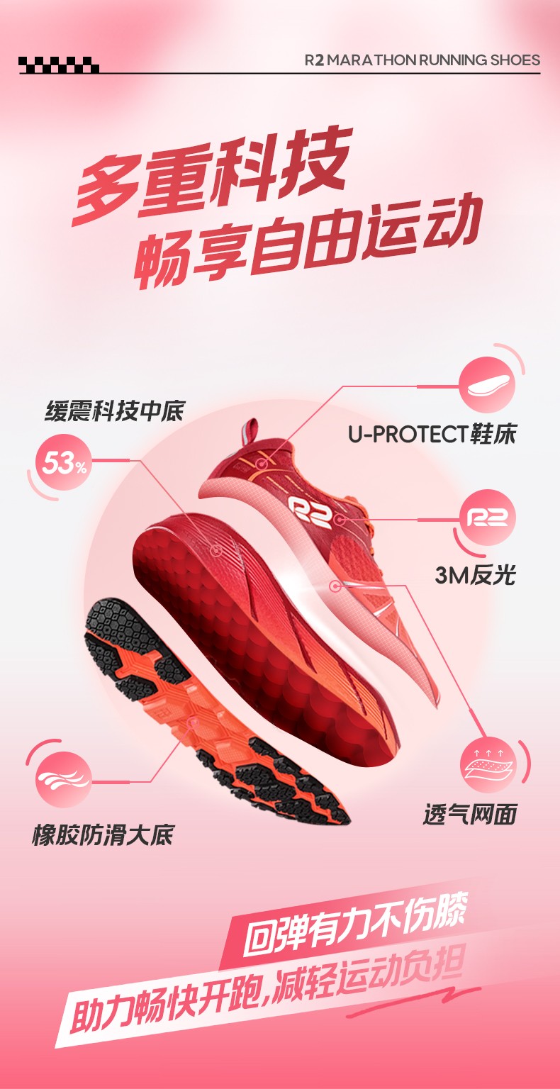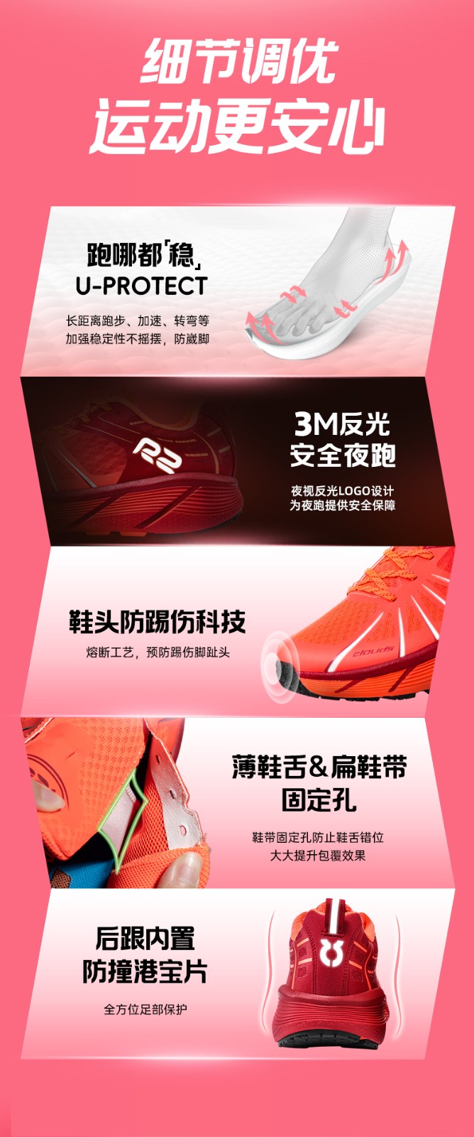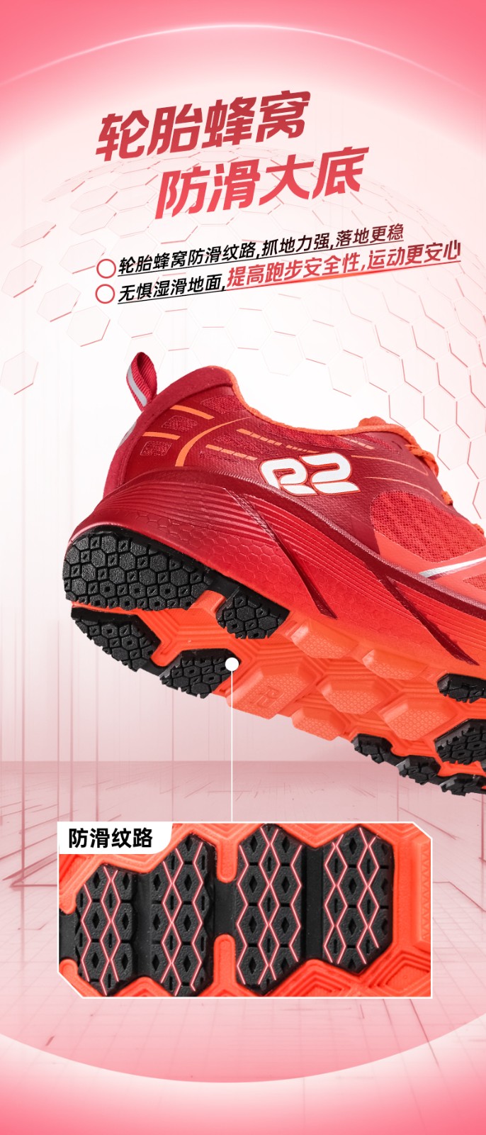 特征:厚底缓震;轻薄透气;防滑耐磨