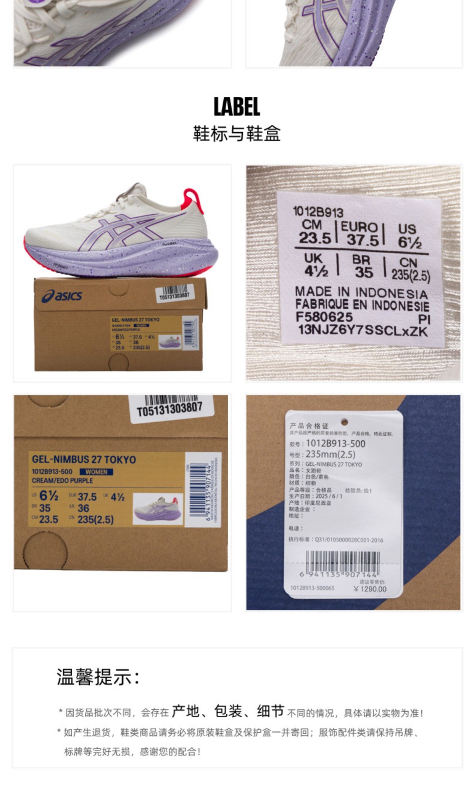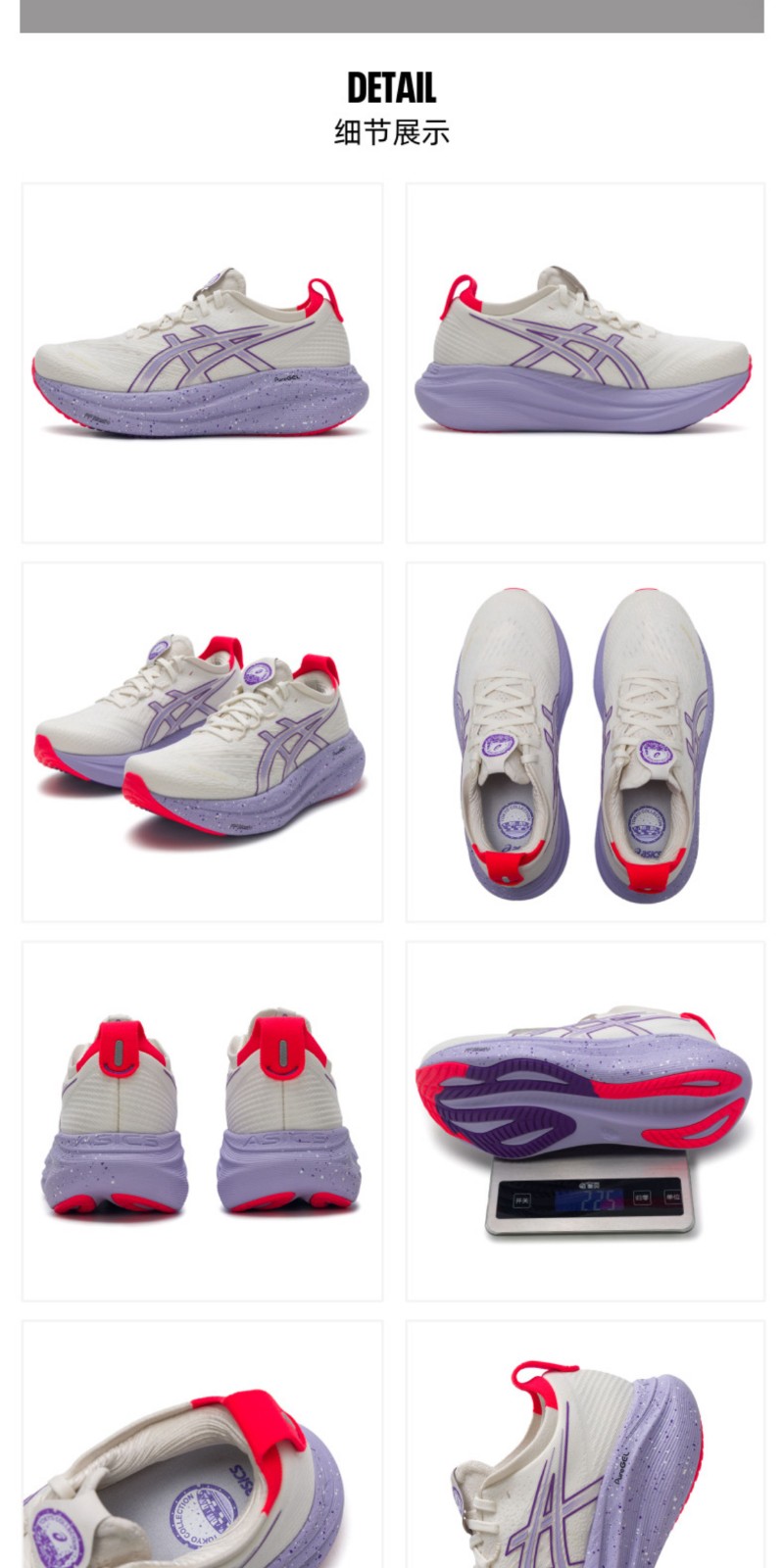 ASICS亚瑟士 女跑步鞋 GEL-NIMBUS 27 TOKYO跑鞋 轻量缓震透气跑步鞋 耐磨时尚运动鞋 1012B913-500 白色/紫色