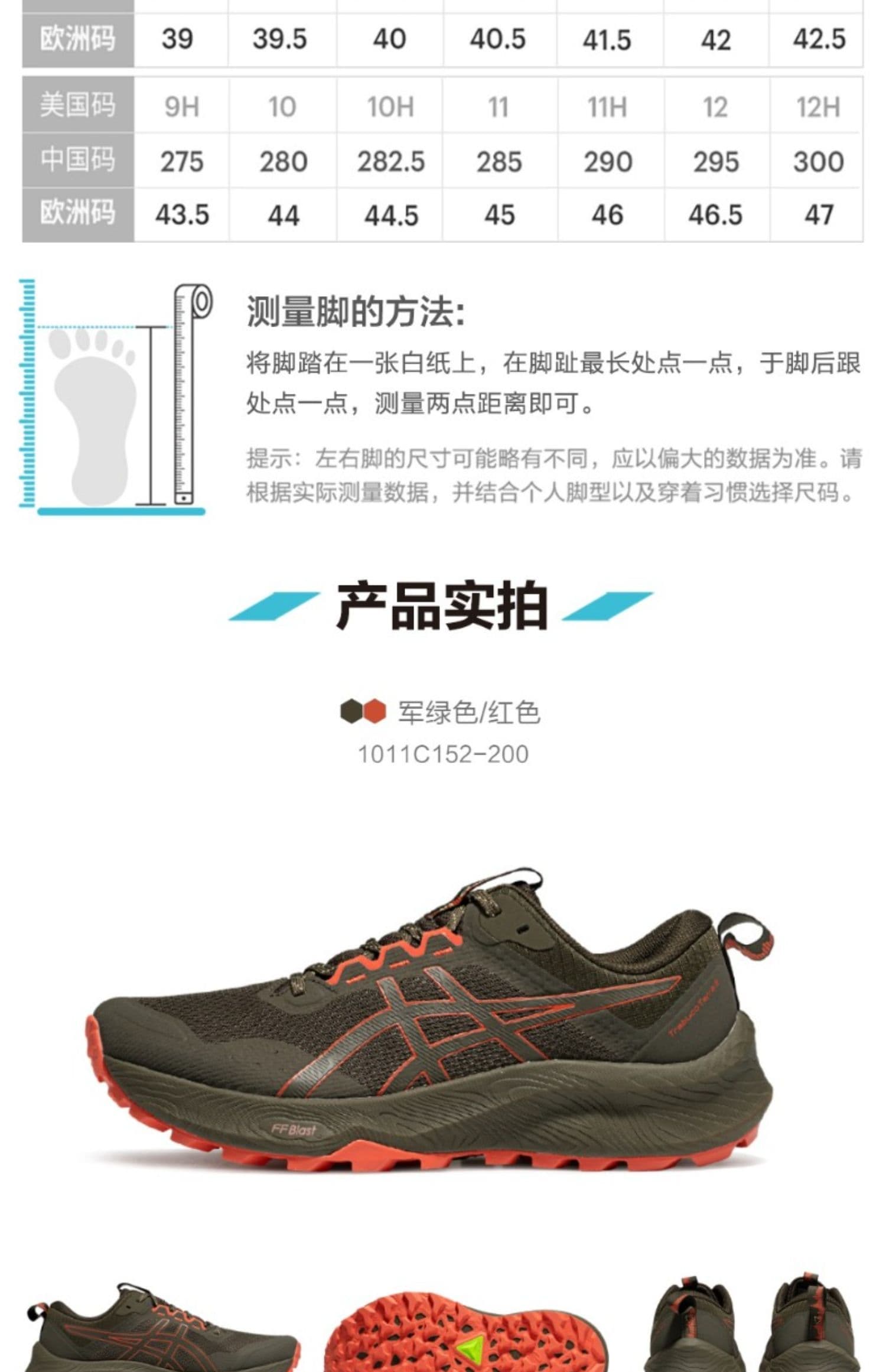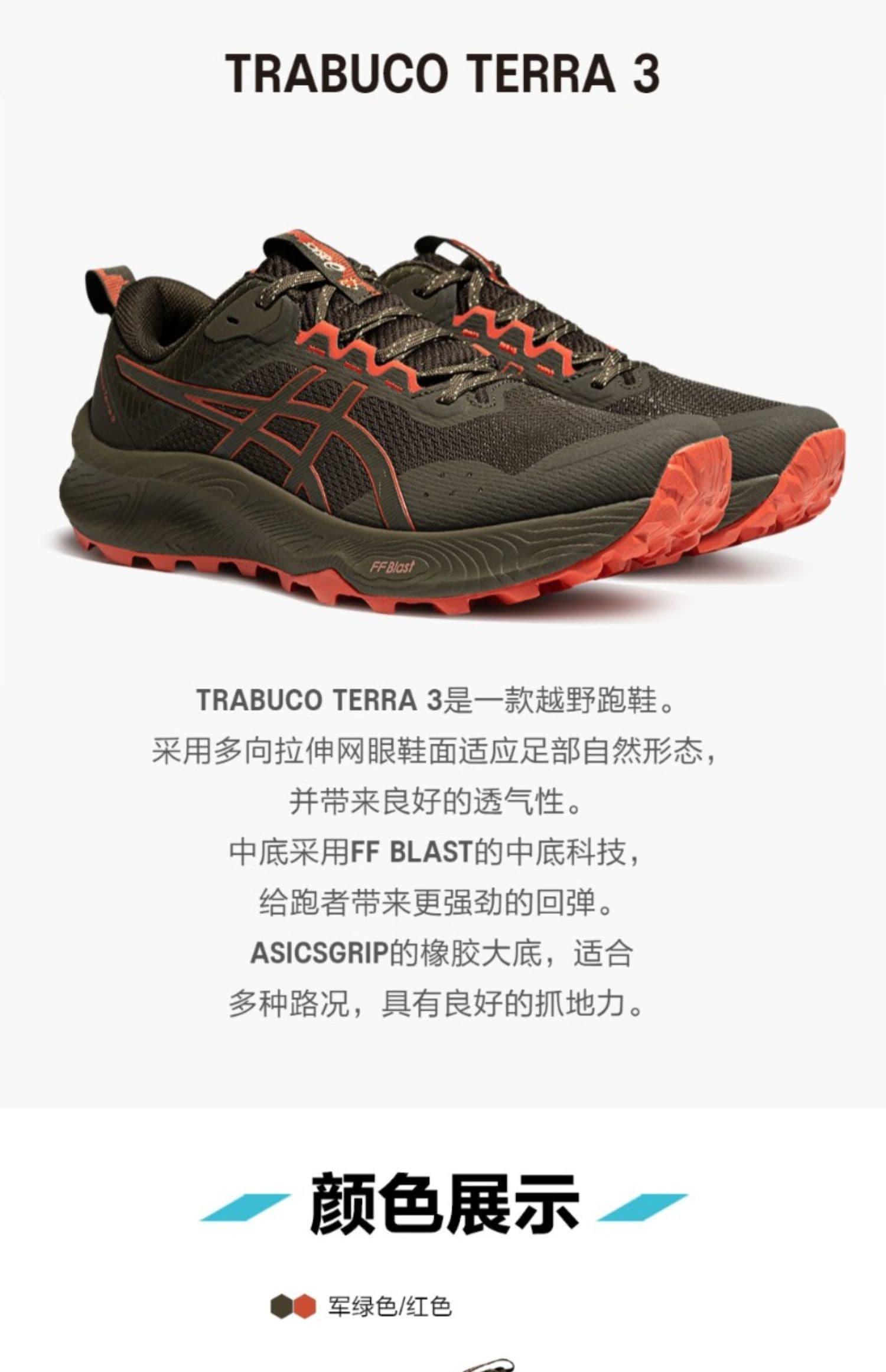 ASICS亚瑟士 越野跑鞋 TRABUCO TERRA 3男子越野跑鞋支撑回弹抓地运动鞋 1011C152-200 军绿色/红色
