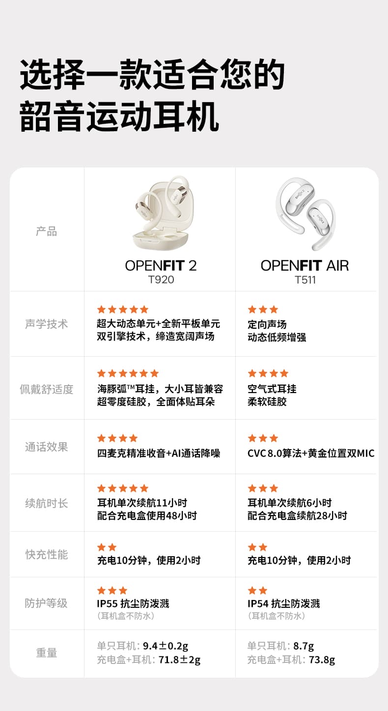 Shokz韶音 运动耳机 舒适圈OpenFit 2开放式无线蓝牙耳机挂耳 健身跑步骑行运动耳机 T920 双色可选