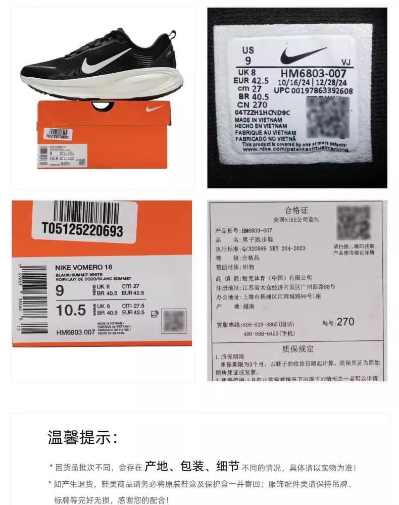 NIKE耐克 男跑步鞋 VOMERO 18迈柔缓震公路专业跑步鞋 运动百搭跑步鞋 HM6803-007 黑色