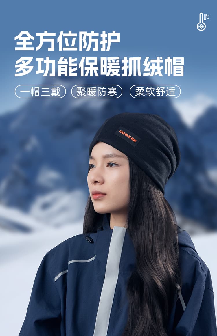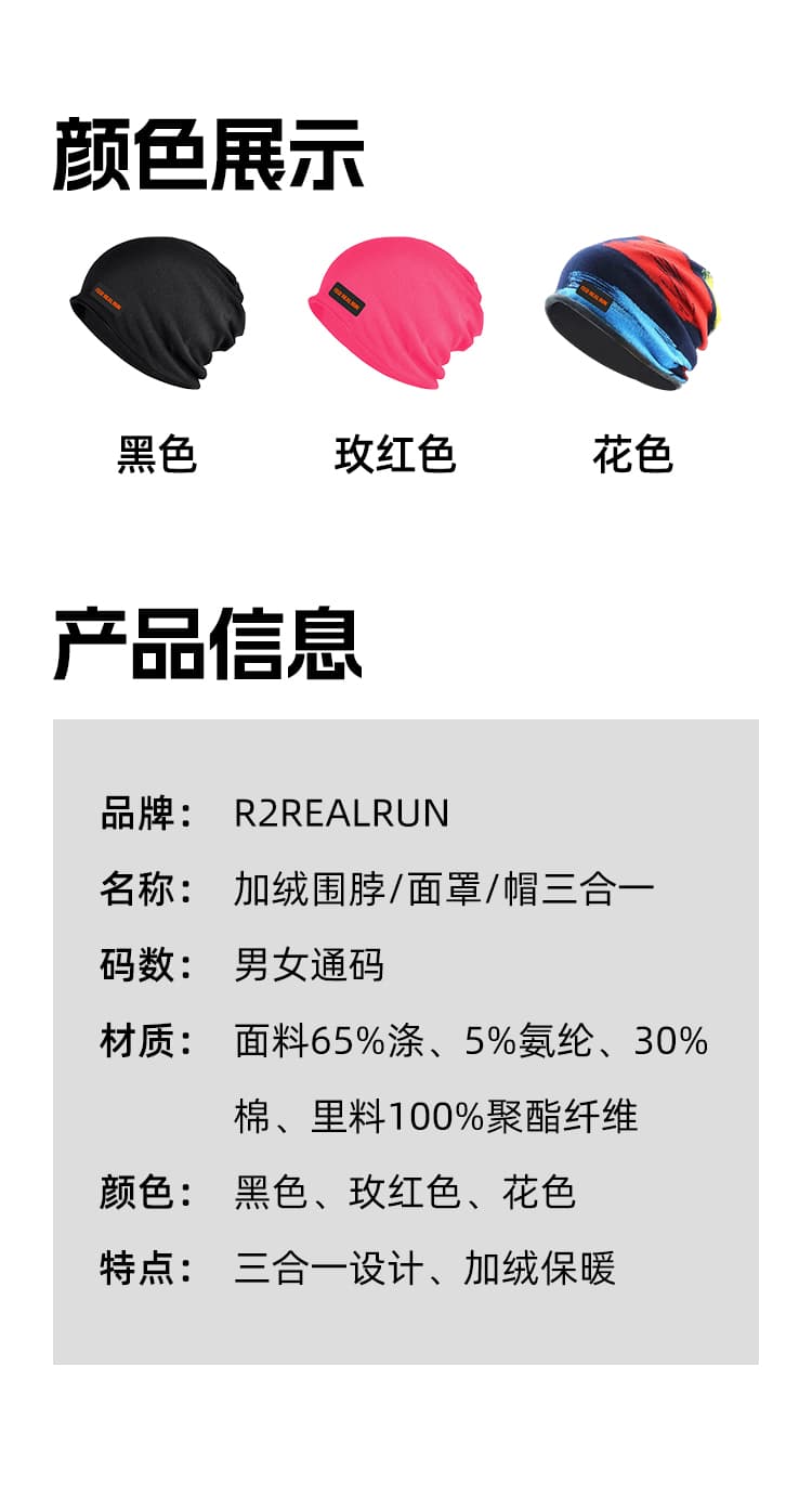 R2 REALRUN 加绒围脖/面罩/帽三合一 多功能保暖抓绒帽 秋冬季户外运动跑步防风护耳帽男女 三色可选
