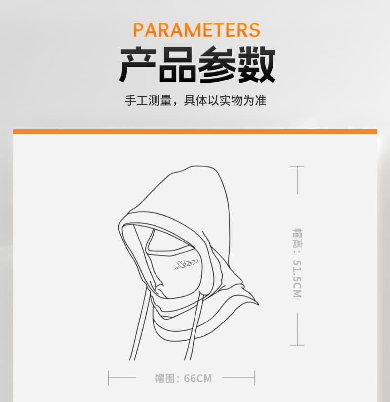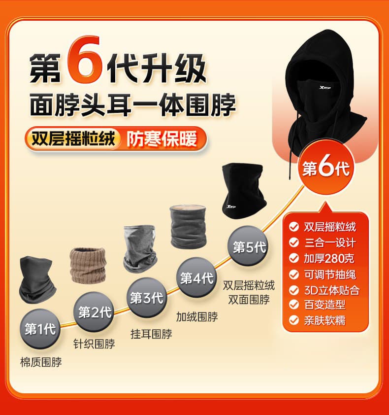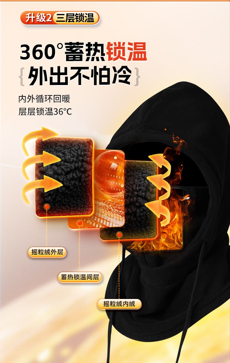 结构含 360° 防护(护颈到锁骨、护耳)、三形态切换(帽子 / 面罩 / 围脖)