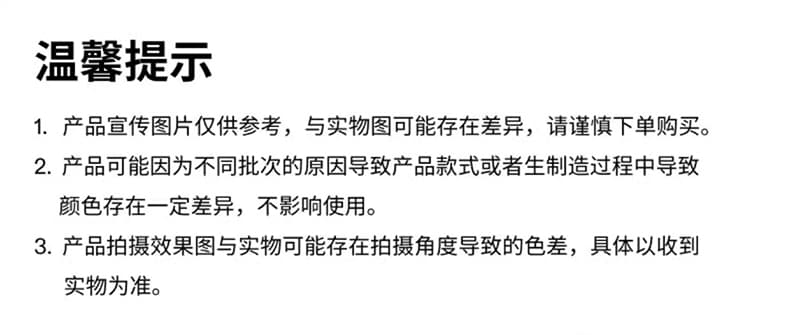 2)七天退换保障:自您签收商品后7天内,因尺码不合适,货品外观大小,颜色,形状的感受偏差,订购错误等,在商品未使用、未拆毁包装、未剪掉或丢失吊卡说明书等不影响二次销售的情况下,可以为您退换商品(下文中说明的不能退换的商品除外)。