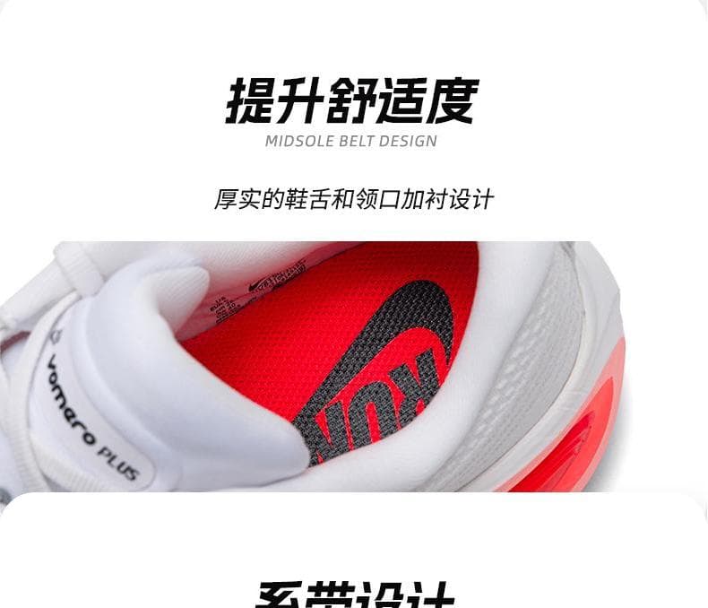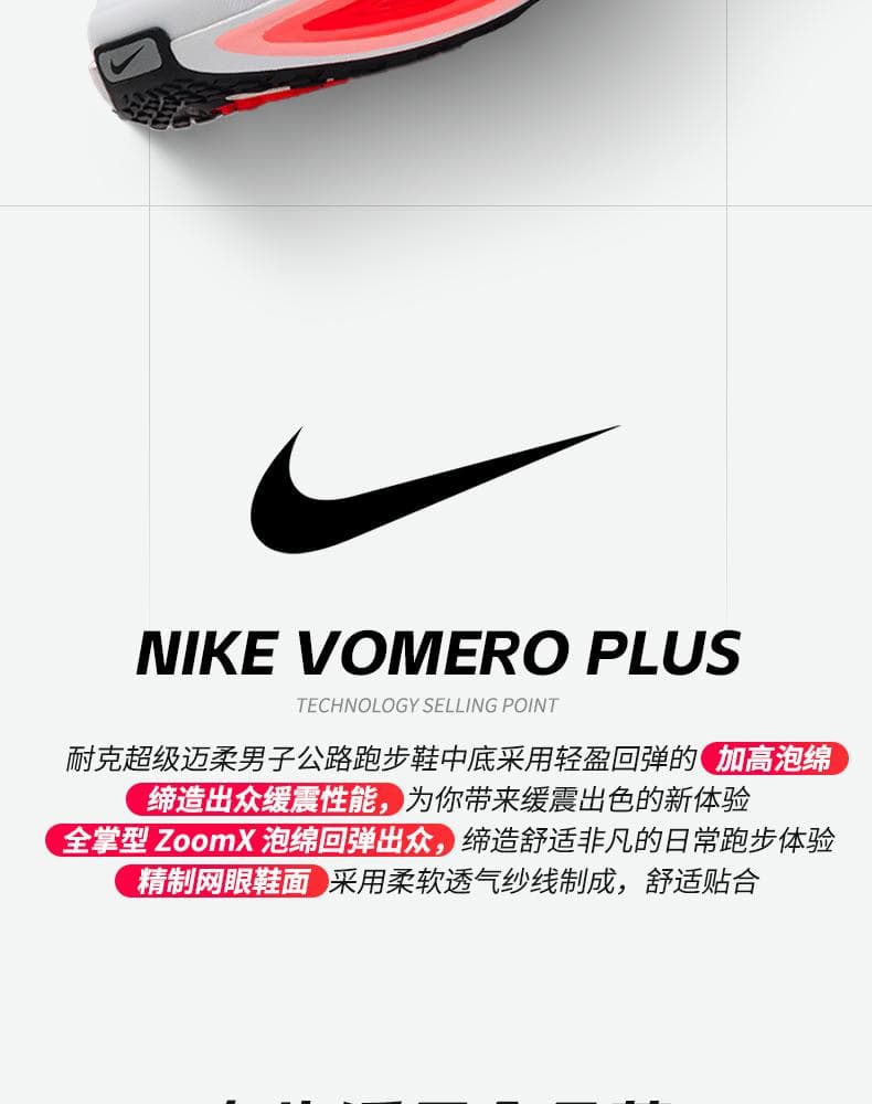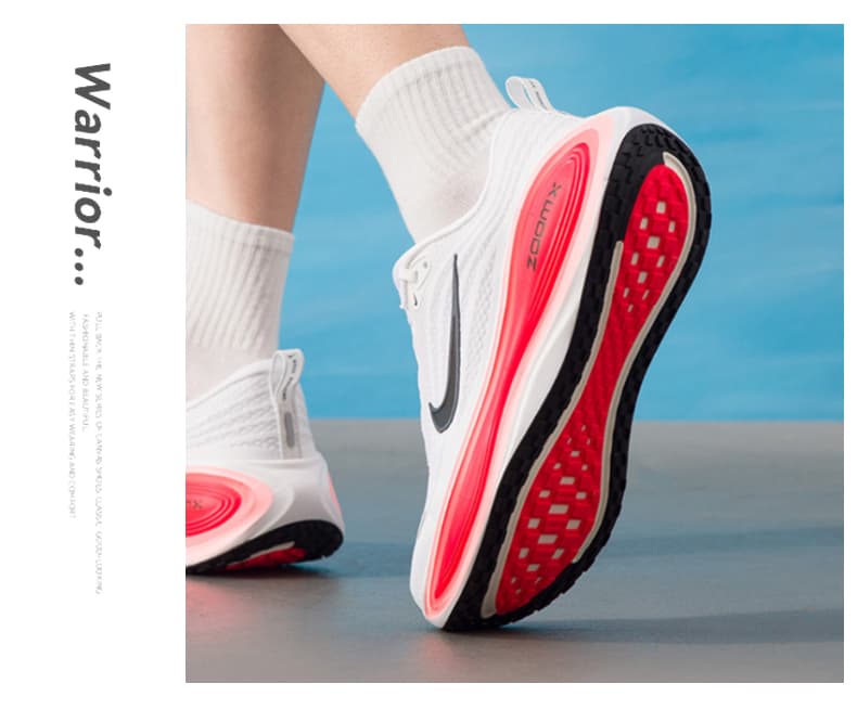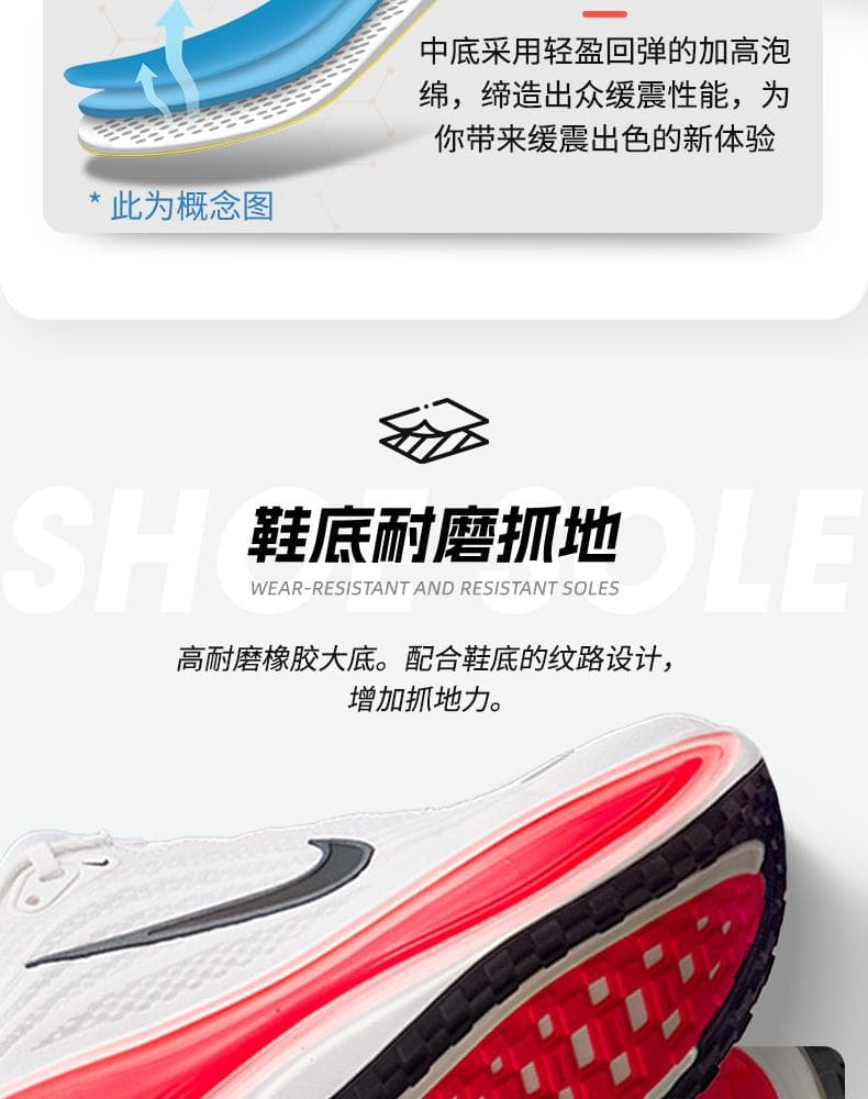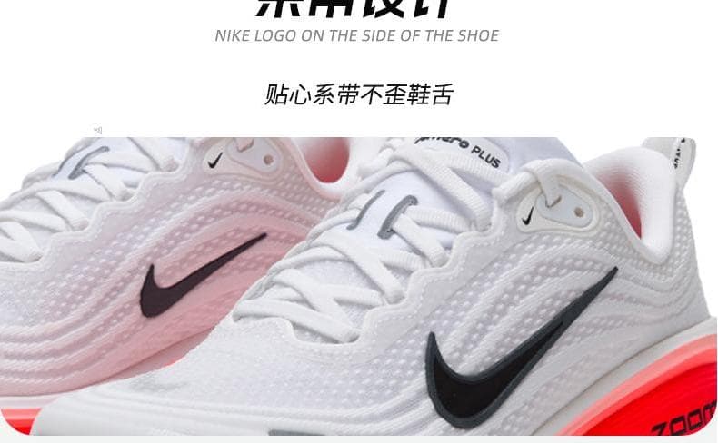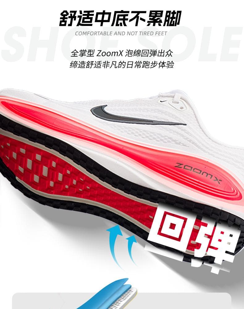 1.全掌ZoomX泡绵中底:采用耐克顶级缓震材料,提供高回弹和低冲击体验,后跟堆叠高度达45mm,有效减少关节压力,适合大体重跑者。