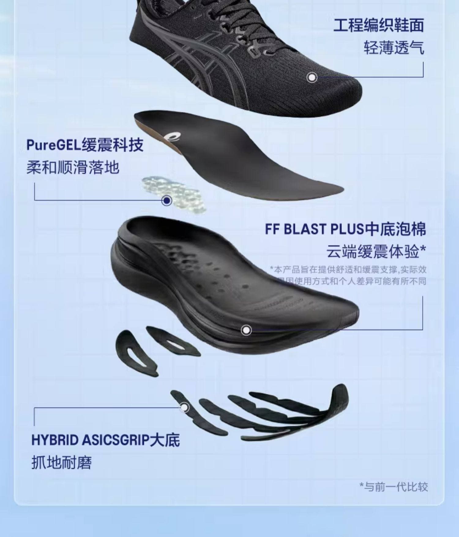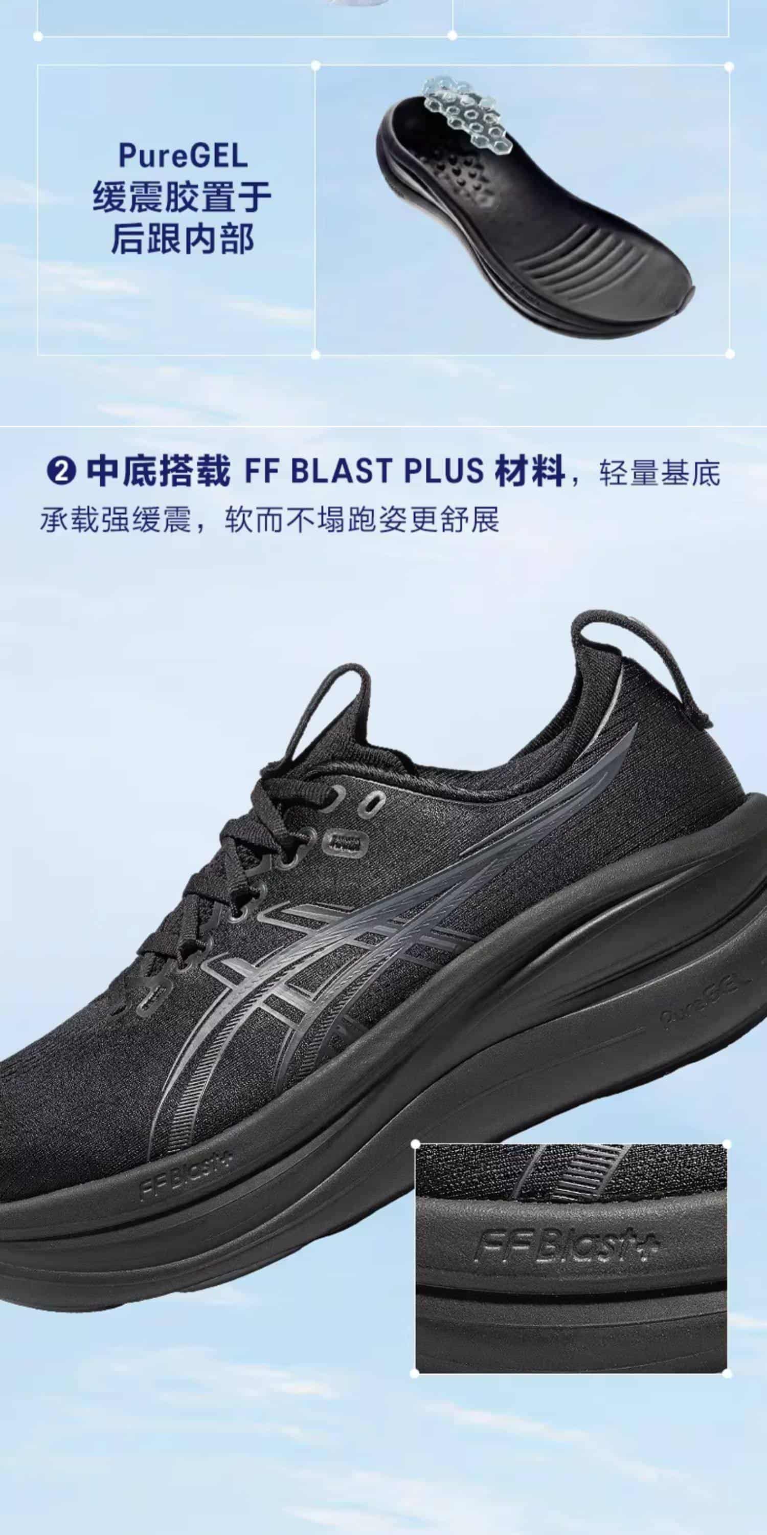 采用?FF BLAST+中底?与?全掌PureGEL凝胶?,后跟厚度44mm,冲击吸收率提升30%,80kg跑者膝盖冲击力降低45%