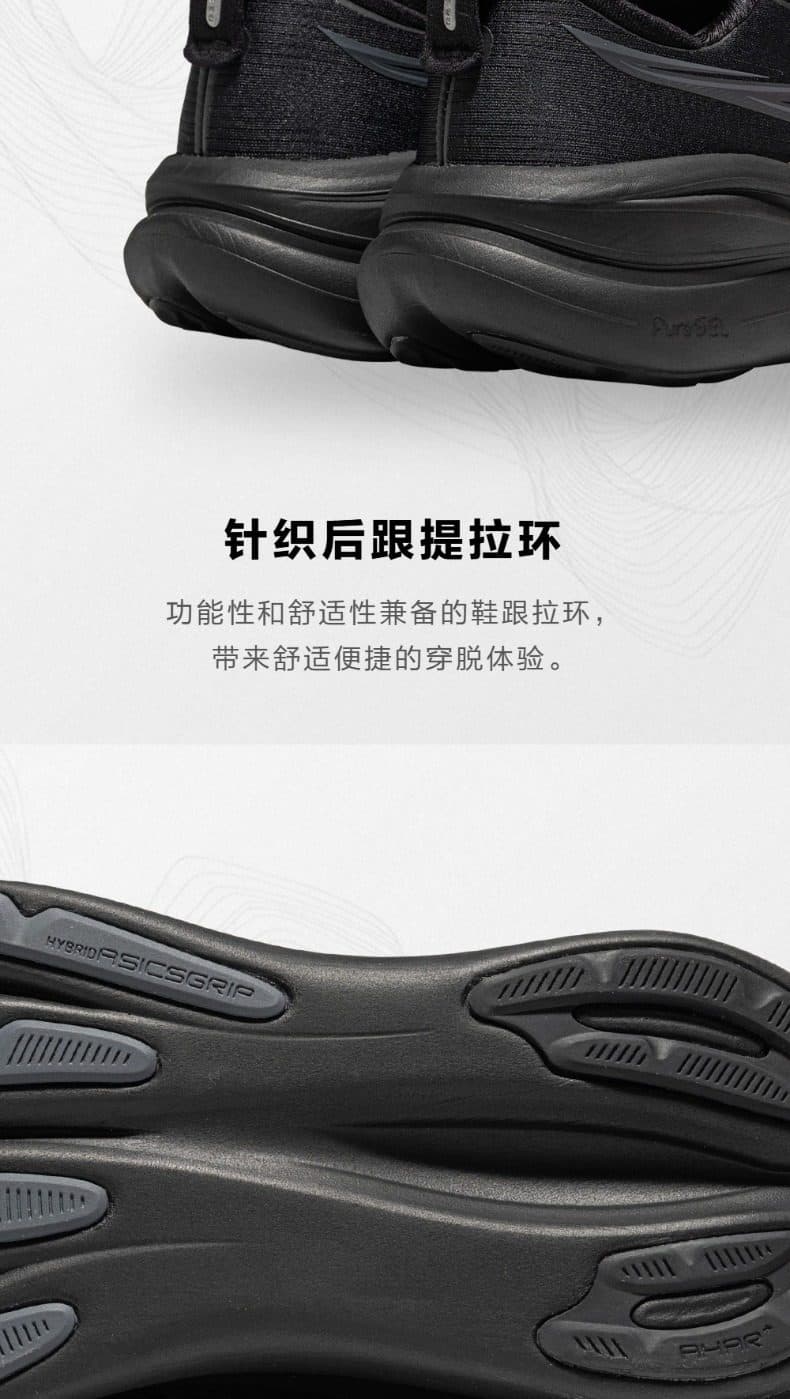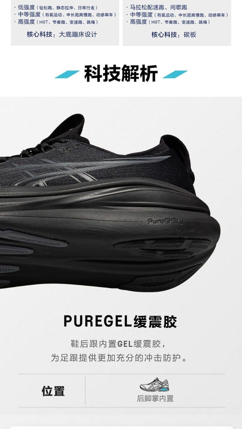 采用?FF BLAST+中底?与?全掌PureGEL凝胶?,后跟厚度44mm,冲击吸收率提升30%,80kg跑者膝盖冲击力降低45%