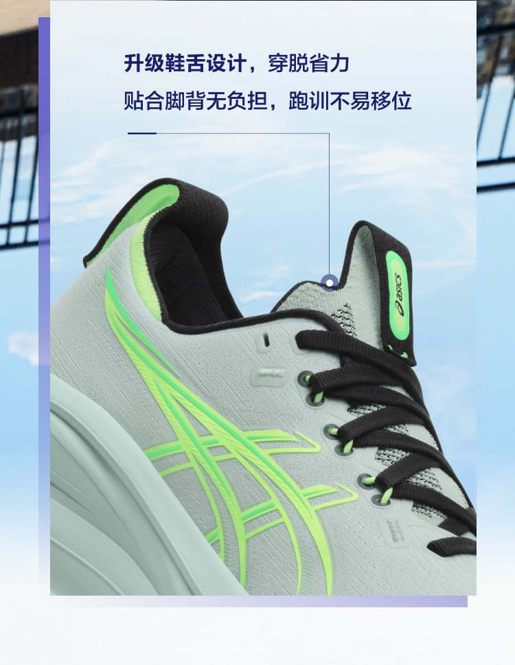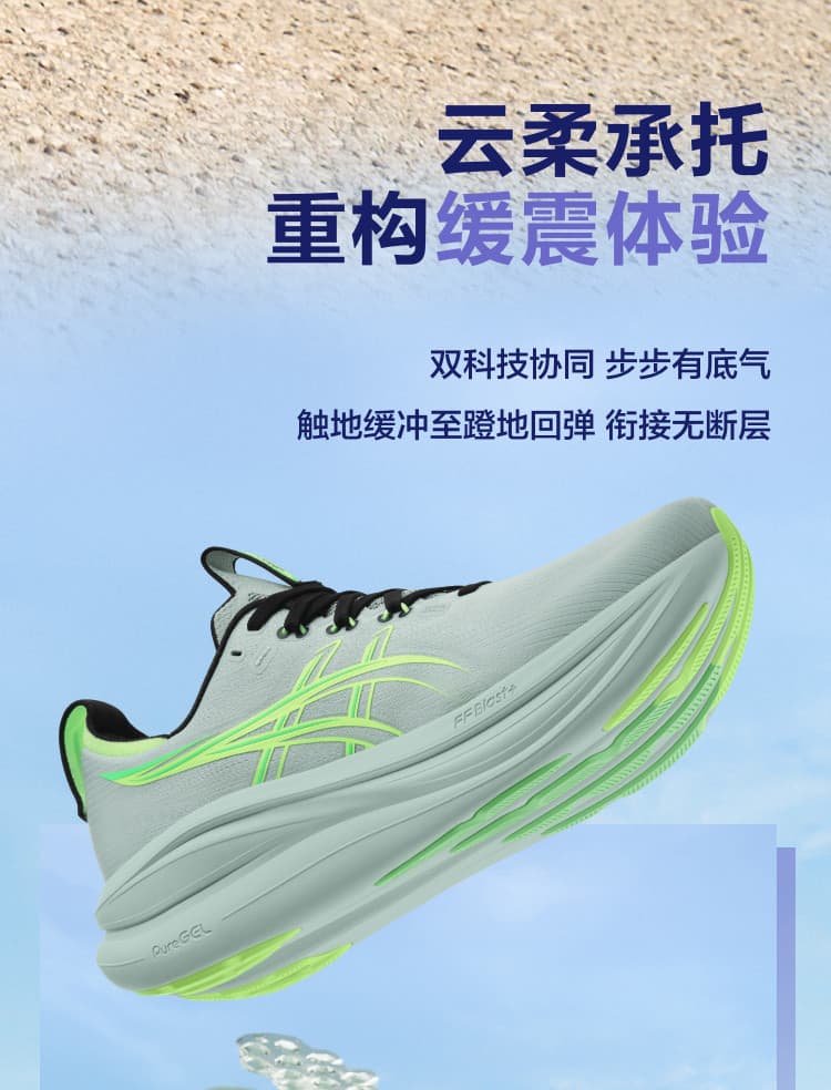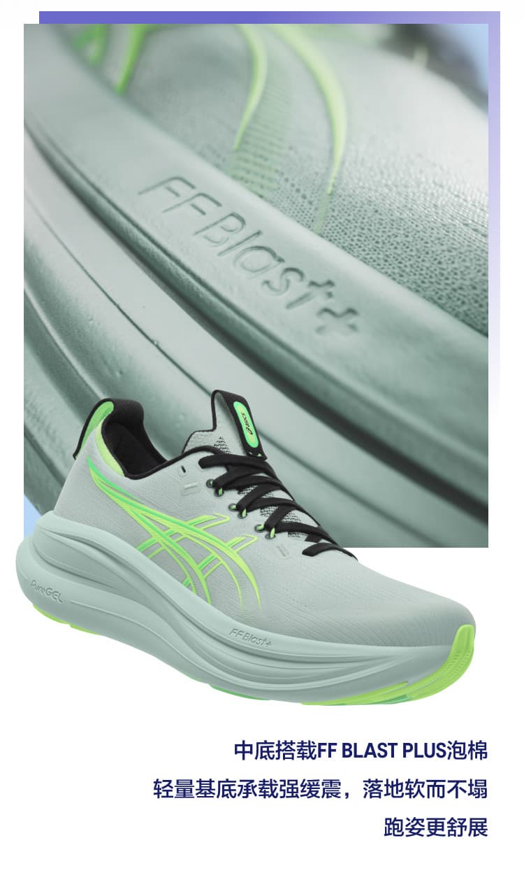 采用?FF BLAST+中底?与?全掌PureGEL凝胶?,后跟厚度44mm,冲击吸收率提升30%,80kg跑者膝盖冲击力降低45%