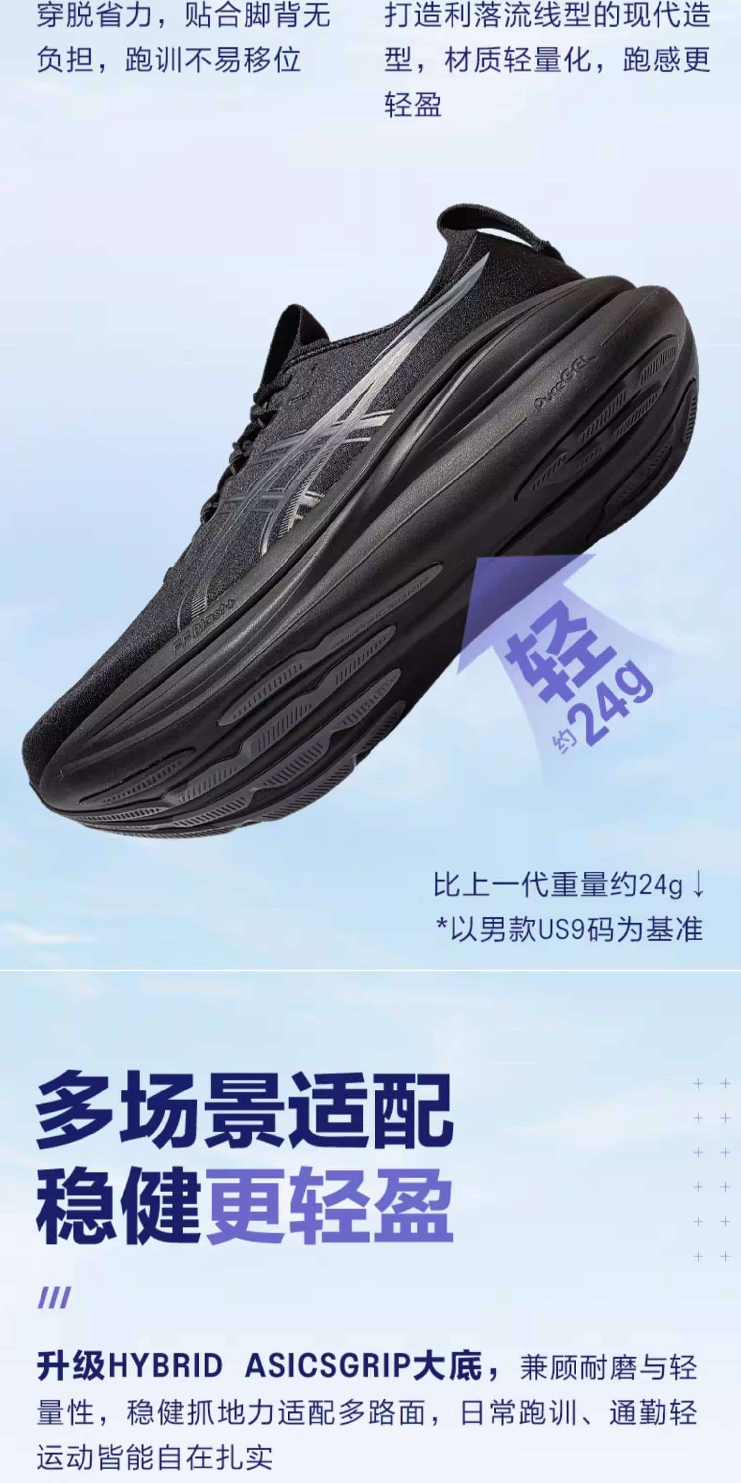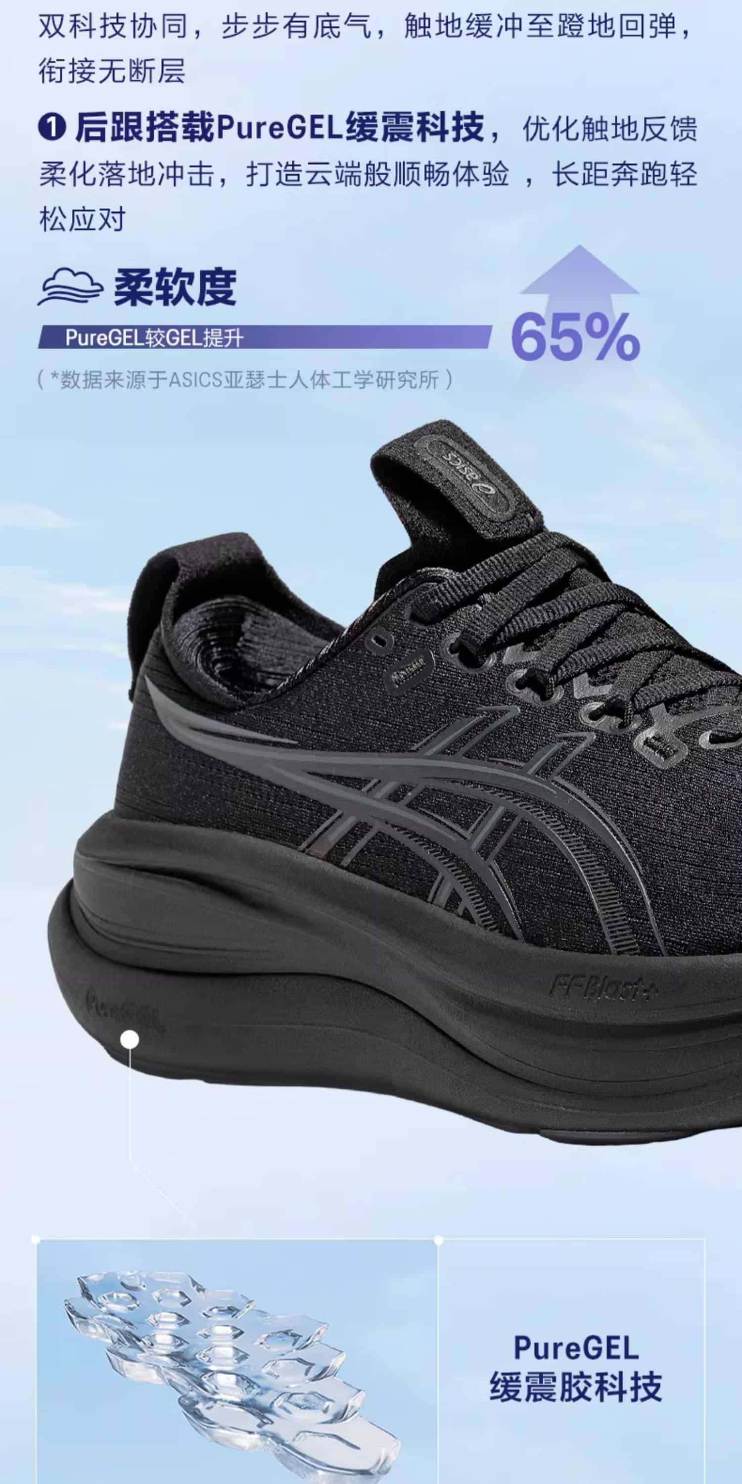 采用?FF BLAST+中底?与?全掌PureGEL凝胶?,后跟厚度44mm,冲击吸收率提升30%,80kg跑者膝盖冲击力降低45%
