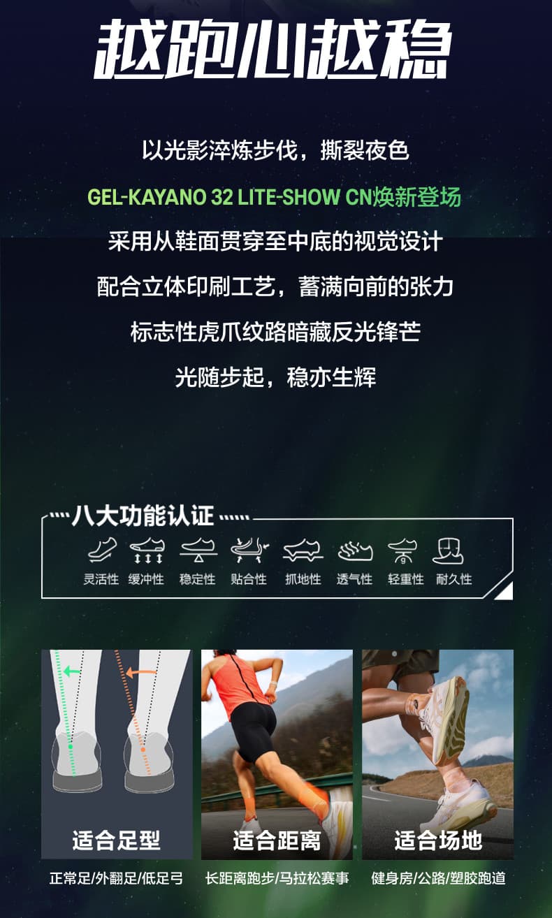 ASICS亚瑟士 男 K32跑步鞋 KAYANO 32 LITE-SHOW反光夜跑款稳定支撑专业运动鞋 1011C262-020 灰色