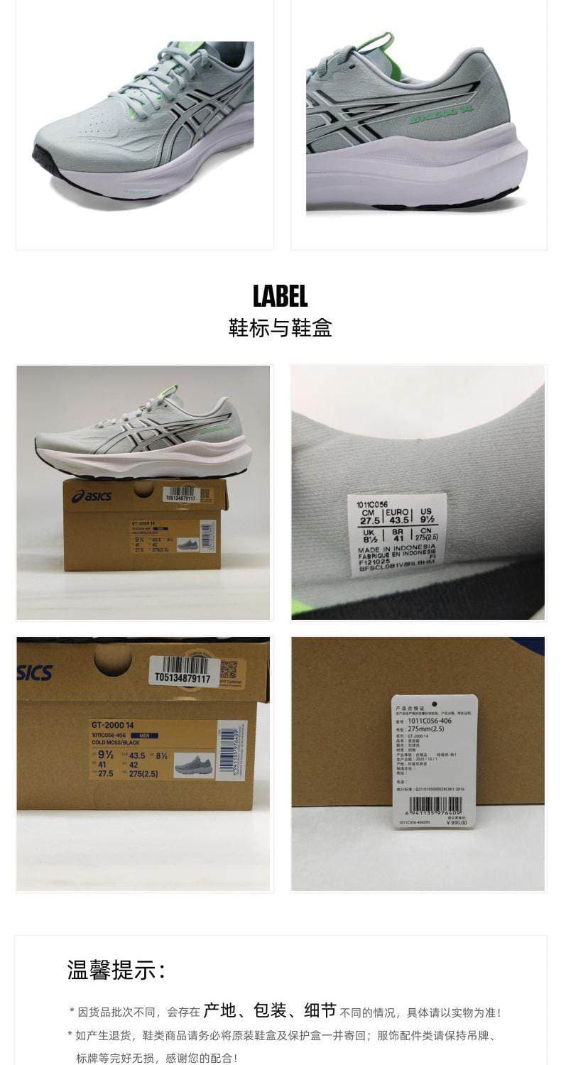 ASICS亚瑟士 男 跑步鞋 GT-2000 14稳定支撑跑鞋 耐磨透气运动鞋 1011C056-406 灰绿色