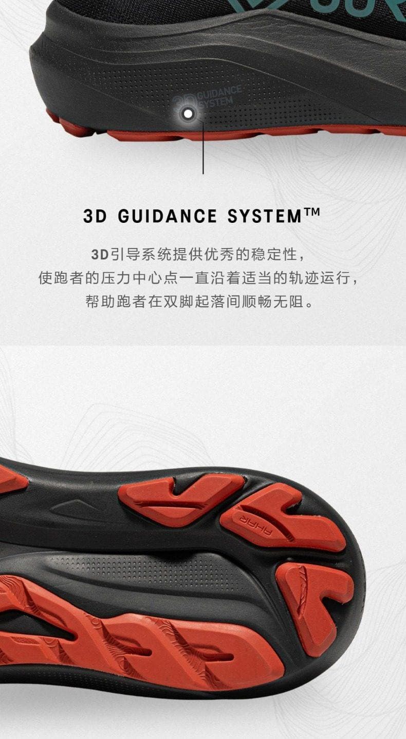 ?稳定支撑?:内置?3D GUIDANCE SYSTEM?,在步态周期中提供恰到好处的支撑,避免过度内旋,保护膝盖和脚踝