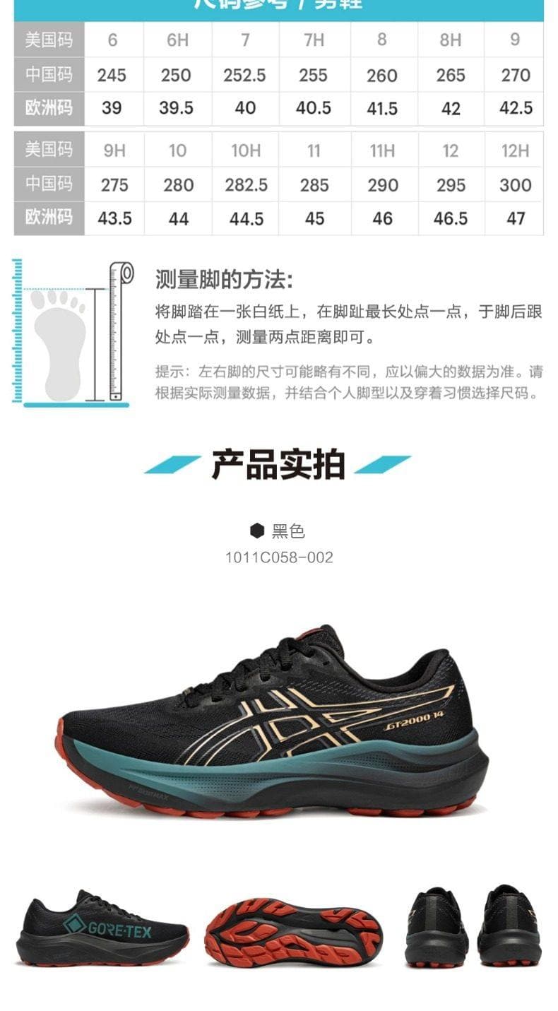 ASICS亚瑟士 男 跑步鞋 GT-2000 14 GTX稳定支撑跑鞋 耐磨透气运动鞋 1011C058-002 黑色